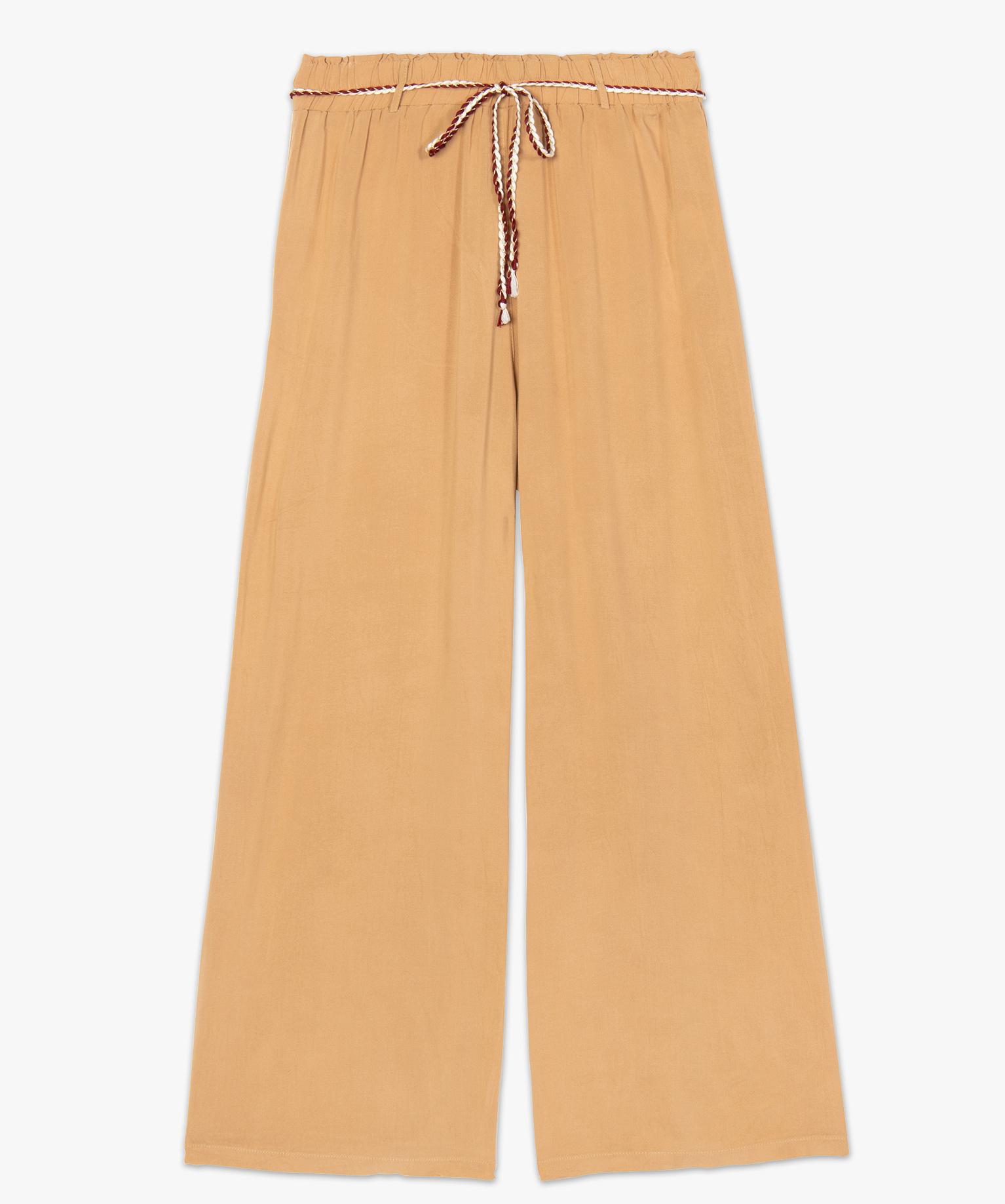 Avec sa belle taille haute et son cordon tressé, sa coupe large et sa matière fluide, ce superbe pantalon pour femme vous séduira à coup sûr. Avec un débardeur en plein cœur l'été, un caraco satiné pour une soirée chic ou un pull en maille fine les jours les plus frais, ce pantalon est un must-have du dressing féminin. Double passants. Large élastique à la taille (6 cm). Ourlet surpiqué en bas de jambe.