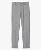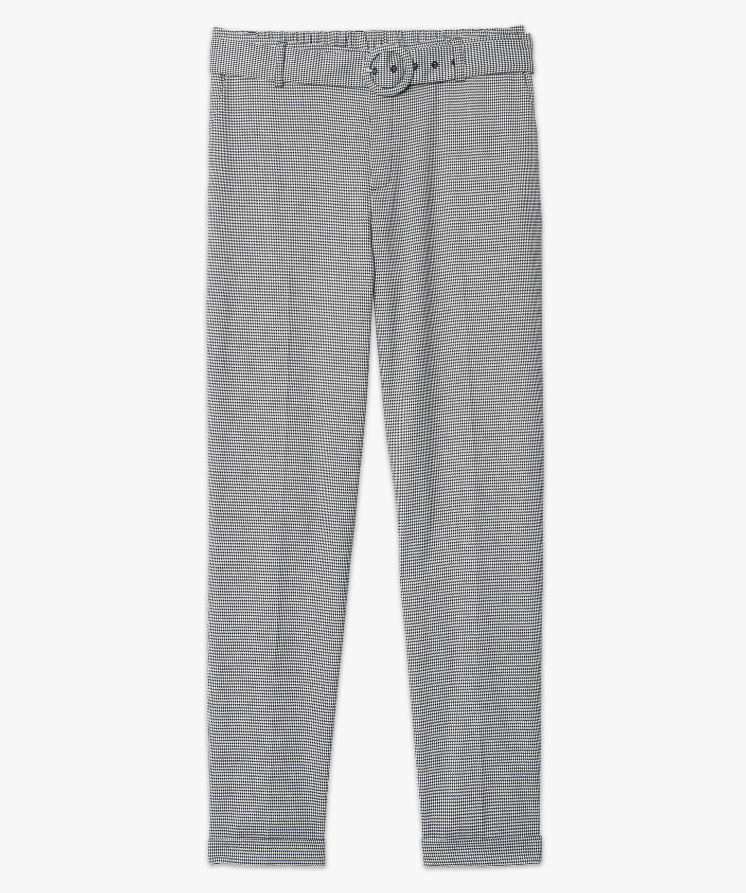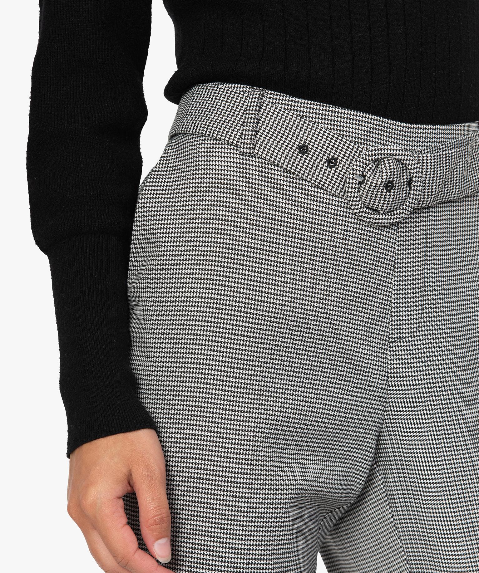 Pantalon femme pied-de-poule à ceinture et revers blanc