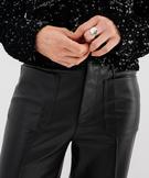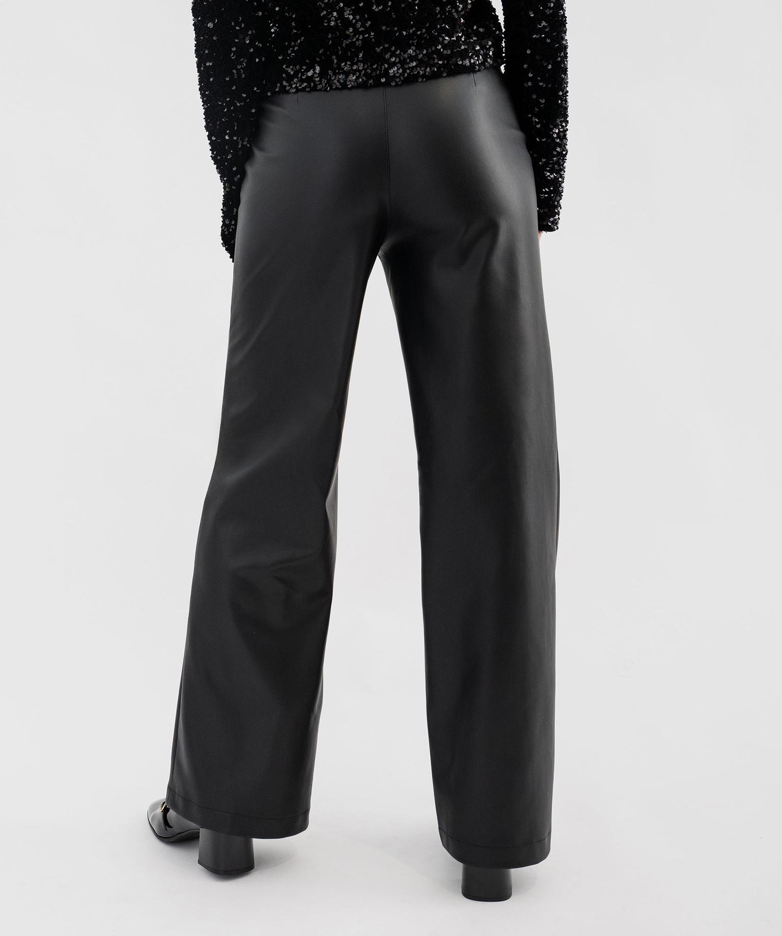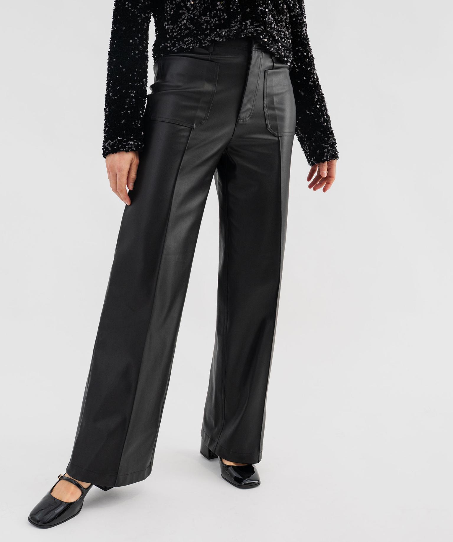 Audacieux et élégant, ce pantalon taille haute en cuir imitation adopte une coupe flare qui allonge la silhouette. Les plis surpiqués à l’avant structurent la ligne. Le pantalon femme est doté de 2 grandes poches plaquées pour une touche pratique et contemporaine. Facile à associer avec un top près du corps ou une chemise en satin, le pantalon se porte aussi bien en journée qu’en soirée. Un modèle tendance qui conjugue confort, style et caractère. Taille marquée. Pinces au dos. Passants pour ceinture. Fermeture zip et crochet.