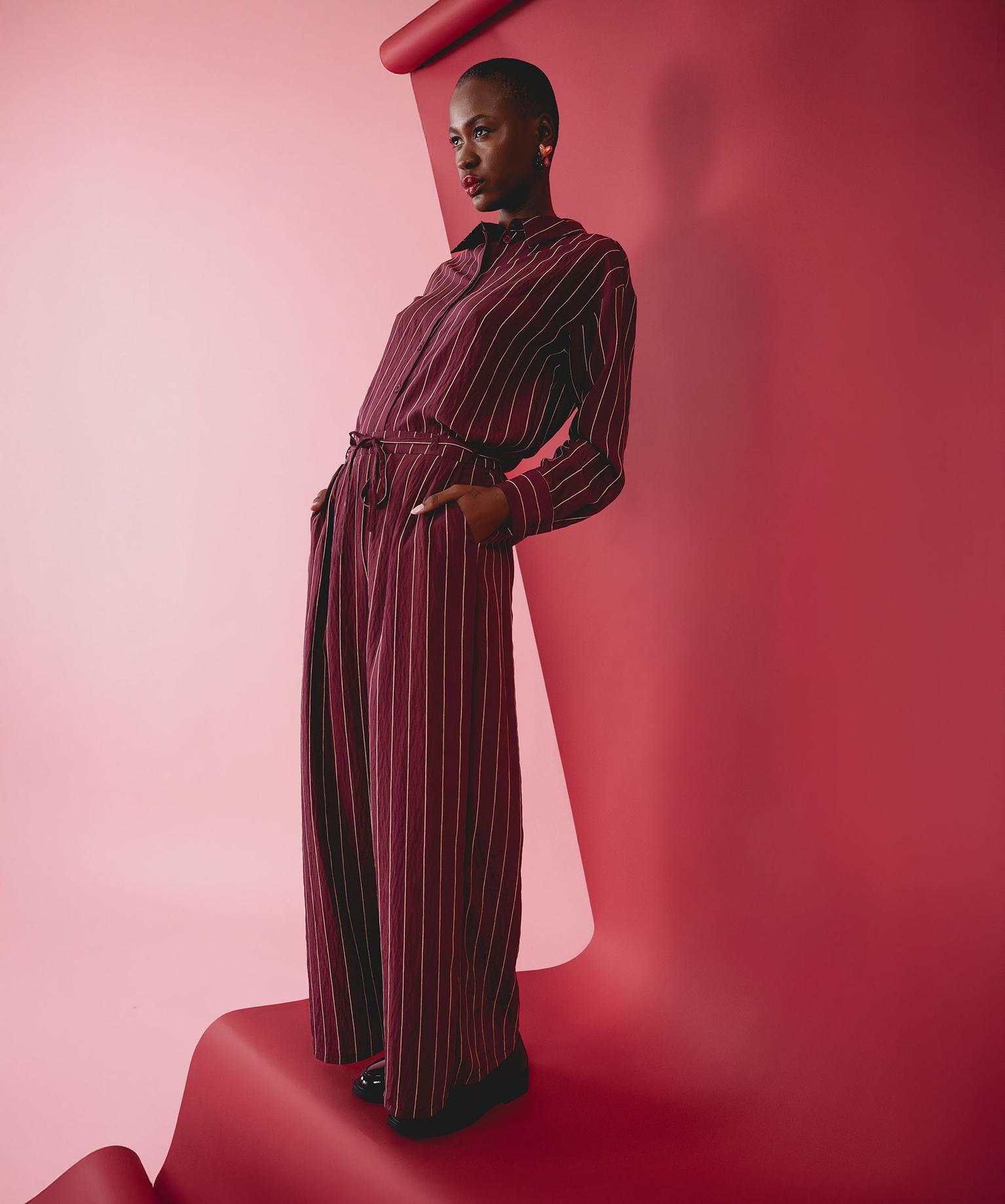 Pantalon fluide coupe large à rayures avec ceinture à nouer femme rouge fonce