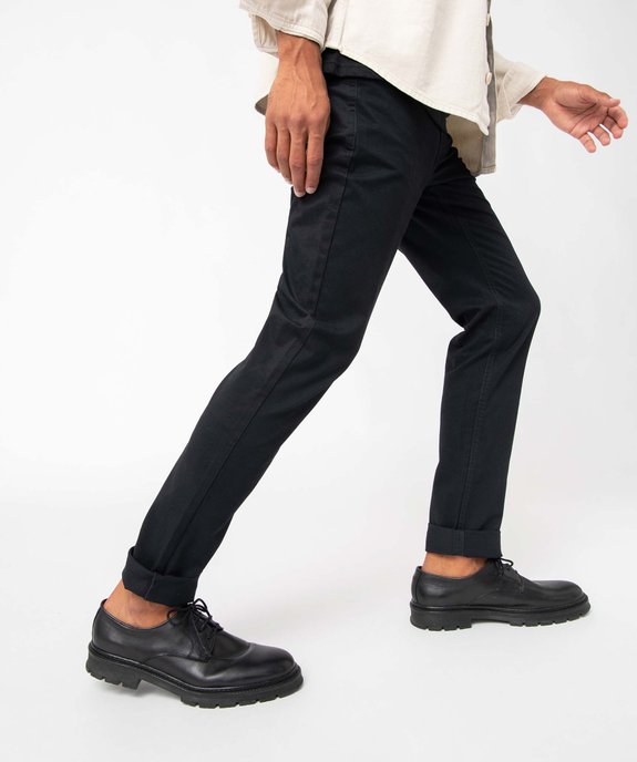 Toujours élégant, tout en restant casual, le pantalon 5 poches avec sa coupe slim. Ce pantalon pour homme uni, décliné dans de nombreux coloris, trouvera forcément sa place dans votre dressing. Il se combinera parfaitement à vos différents tee-shirts, pulls, sweats, chemises, etc. Ce pantalon est composé de stretch pour vous assurer un maximum de confort au quotidien. En coton majoritaire, sa texture est très douce. Ayant subi une teinture spéciale, le pantalon affiche un coloris unique. 3 poches rivetées devant + 2 poches plaquées au dos. Fermeture zip + bouton. Ceinture sous passants.