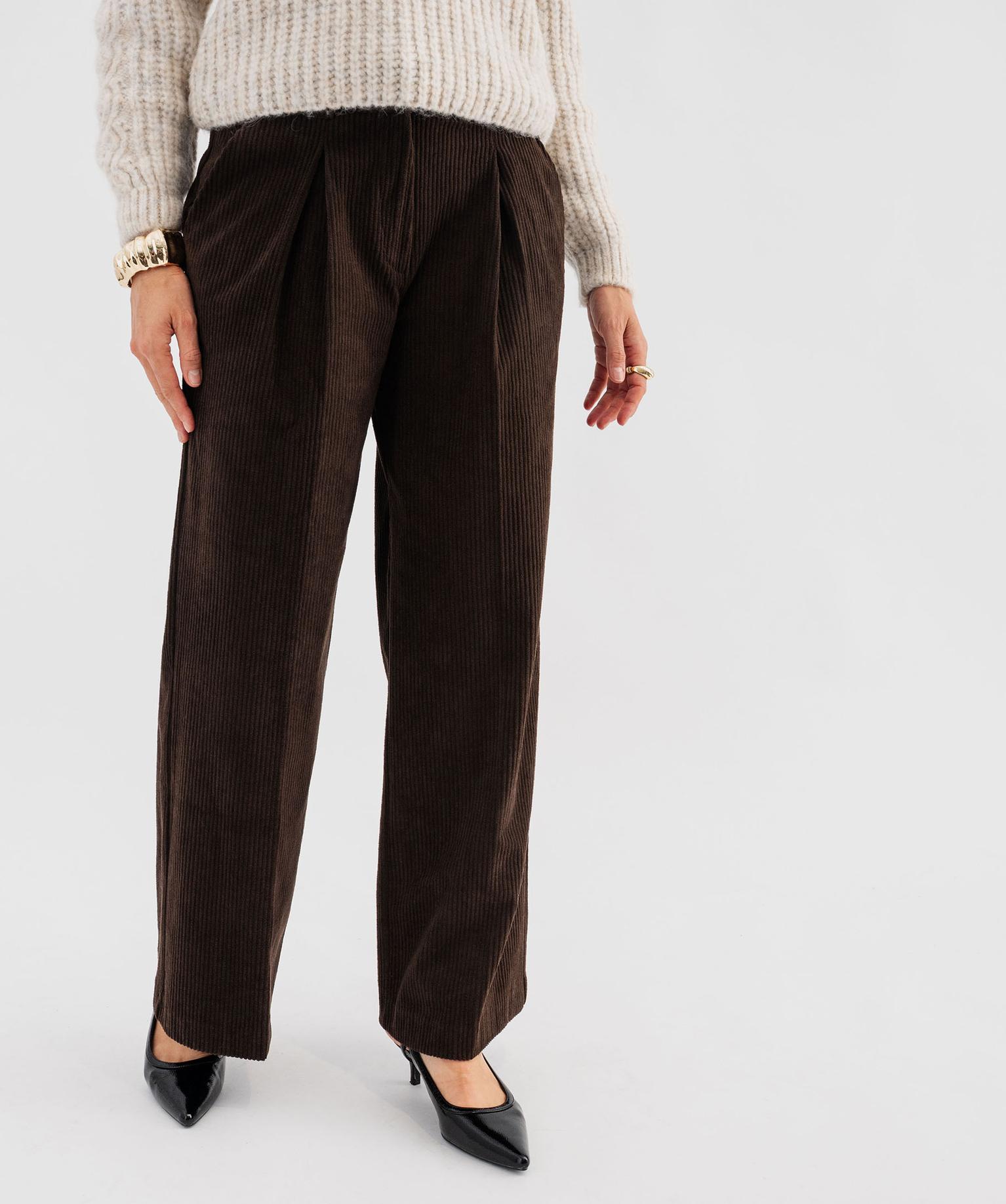 Craquez pour ce pantalon femme en velours côtelé, une pièce tailoring élégante et tendance. Sa coupe large est structurée par des plis creux devant et des pinces au dos pour un tomber impeccable. La large ceinture, agrémentée de passants, se ferme par zip et un double crochet discret, pour une finition soignée. On retrouve 2 poches italiennes pratiques et 2 fausses poches passepoilées au dos, qui ajoutent une touche chic et citadine. Un pantalon esprit tailleur à porter de manière chic avec une chemise et un blazer, ou plus cosy avec une grosse maille et des boots crantées.