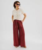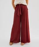 Pantalon large et fluide à taille haute ceinturée femme rouge fonce