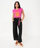 Pantalon ample en crêpe fluide uni et subtilement texturé. Le pantalon femme est monté sur une taille élastiquée et froncée, sublimée par une ceinture à nouer ornée de motifs. La ceinture sous passants est amovible : vous pouvez facilement en changer pour donner à votre pantalon un tout autre style. Taille haute, 2 poches italiennes.