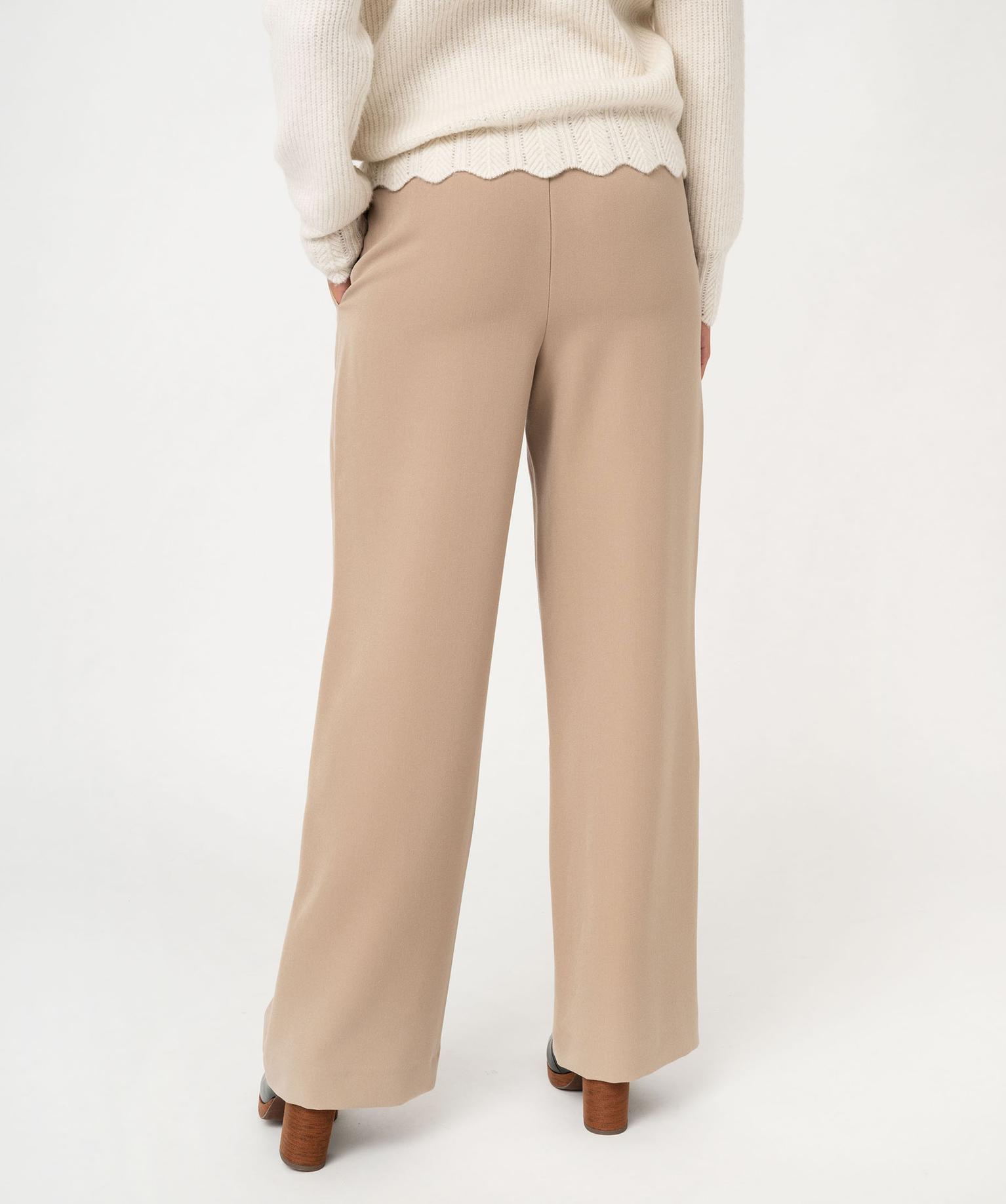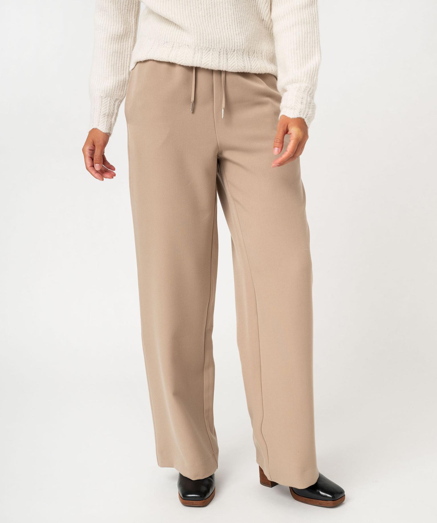 Un pantalon uni à la jambe large, monté sur une taille élastiquée pour allier tendance et confort ! Cet élégant pantalon femme est confectionné dans un tissu un peu épais mais très souple et extensible, pour un tomber élégant et une silhouette souple. Il se porte aussi bien avec une chemise, une veste blazer et des escarpins, que de façon plus décontractée avec un petit blouson, un tee-shirt et des baskets. Le pantalon possède deux poches discrètes intégrées dans les coutures latérales, des passants pour ceinture, deux liens à nouer devant avec embout métal.