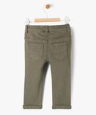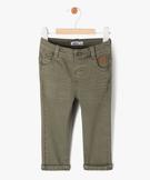 Le pantalon slim habille aussi les tout-petits ! Laissez-vous séduire par ce pantalon bébé garçon tendance et pratique, conçu pour le confort des bambins. Ce modèle est confectionné dans une toile de coton stretch particulièrement extensible pour accompagner tous les mouvements des petits. Il est doté d'un système de réglage à la taille pour un ajustement optimal à toutes les morphologies. Ce pantalon uni sera une base efficace pour tous les looks de votre bambin. 3 poches sur l’avant et 2 sur l’arrière. Fermeture facile par 1 bouton-pression. Finitions travaillées : fausse boutonnière, petite étiquette brodée au niveau de la poche, double surpiqûre. Un pantalon à porter avec le bas retroussé et des tennis.