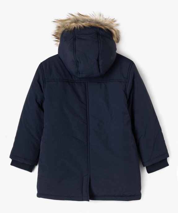 Un manteau ultra pratique qui répond à toutes les attentes des enfants pendant la saison hivernale. La capuche est doublée de maille polaire et bordée de fausse fourrure. Doublure en maille bouclette fixée par zip et boutons pression. Manchons en bord-côte à l’intérieur des manches. Parka fermée par zip sous patte pressionnée. Deux poches à rabat et une poche raglan, fermées par pressions.