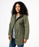L'incontournable parka se décline ici en version légère, idéale pour la mi-saison ou à combiner avec un pull en grosse maille ou une doudoune sans manches par exemple. Le manteau pour femme grande taille (du 48 au 56) affiche de belles finitions pour un résultat girly et pratique : col montant combiné à une capuche, double fermeture zip + boutons-pression dorés, taille ajustable par cordon pour marquer la silhouette, grandes poches plaquées à rabat pressionné, doublure intégrale, toucher peau de pêche extra doux. Un manteau fin, idéal pour contrer le mauvais temps avec style.