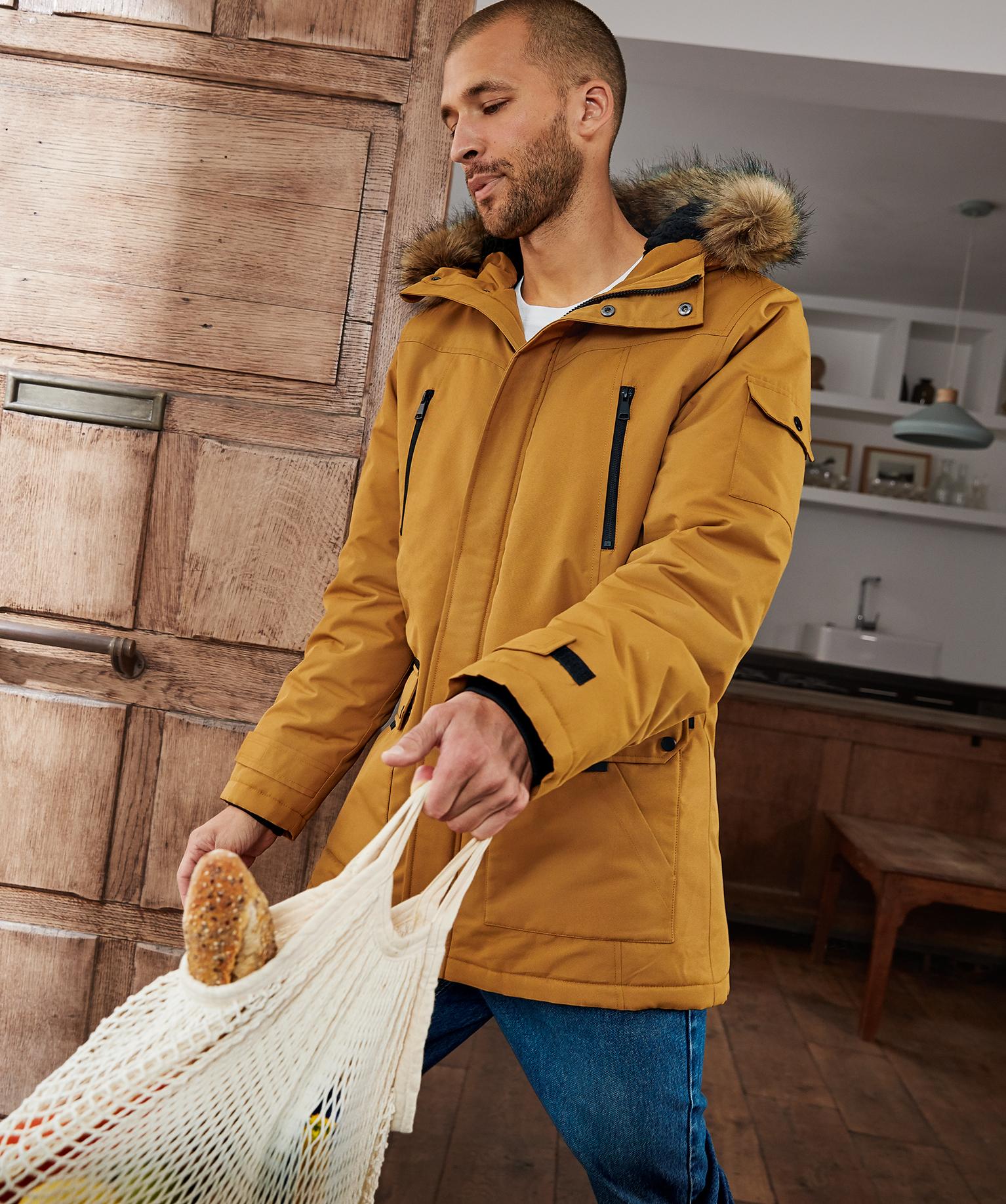 Cette parka a été spécialement conçue pour affronter le plein hiver. Elle est entièrement matelassée et possède un col montant et une capuche doublée sherpa. La capuche est agrémentée d’un bord amovible en matière synthétique aspect fourrure imitation, qui se retire facilement par zip, vous pourrez ainsi changer de style en un clin d’œil ! Cette parka homme se ferme par zip dissimulé par une patte de fermeture à scratch avec boutons pression dans le bas et au niveau du col, pour une protection optimale contre le froid. Ce blouson mi-long possède également des finitions en bord-côte élastiquées aux poignets. Pour le côté pratique, il possède deux larges poches à rabat pressionné avec ouverture sur le dessus pour y glisser les mains, deux poches zippées sur la poitrine, une poche à rabat pressionné sur l’une des manche et une poche intérieure.