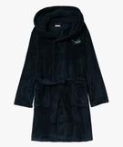 Grand col châle. Deux grandes poches plaquées sur l'avant. Ceinture à nouer, cousue dans le dos, pour ne jamais tomber ou se perdre ! Petit message fantaisie de Noël brodé sur la poitrine. Livré avec son ruban et son étiquette cadeau de Noël, pour le glisser directement sous le sapin !