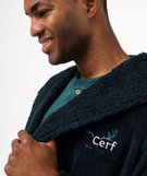 Grand col châle. Deux grandes poches plaquées sur l'avant. Ceinture à nouer, cousue dans le dos, pour ne jamais tomber ou se perdre ! Petit message fantaisie de Noël brodé sur la poitrine. Livré avec son ruban et son étiquette cadeau de Noël, pour le glisser directement sous le sapin !