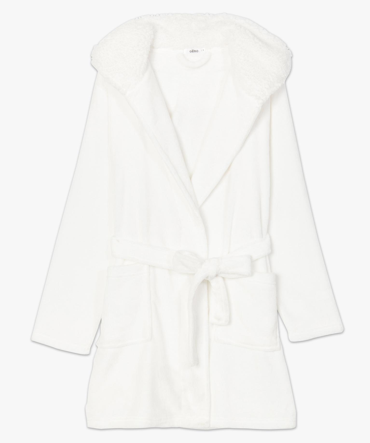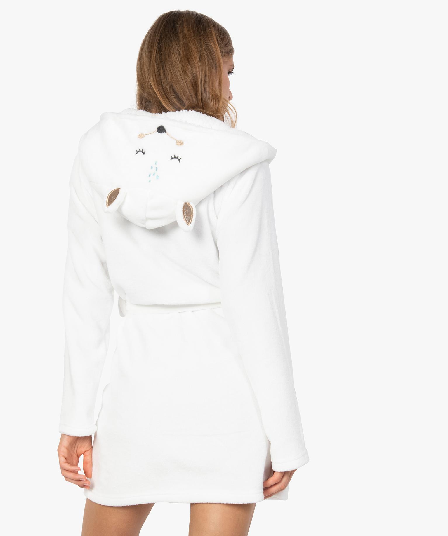 Un peignoir pour femme dont la matière duveteuse saura combler toutes vos envies de douceur. Confectionné dans une matière ultra douce, à l’intérieur comme à l’extérieur, ce peignoir possède une capuche fantaisie doublée de maille sherpa avec broderies représentant un animal et deux petites oreilles en relief. Sa longueur hanche est parfaite pour accompagner une nuisette ou un pantalon de pyjama. Ce peignoir à capuche possède deux grandes poches ouvertes sur l’avant et porte croisé et fermé par une ceinture nouée ton sur ton.