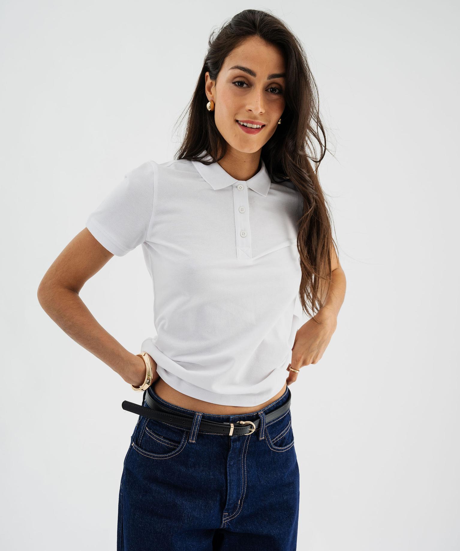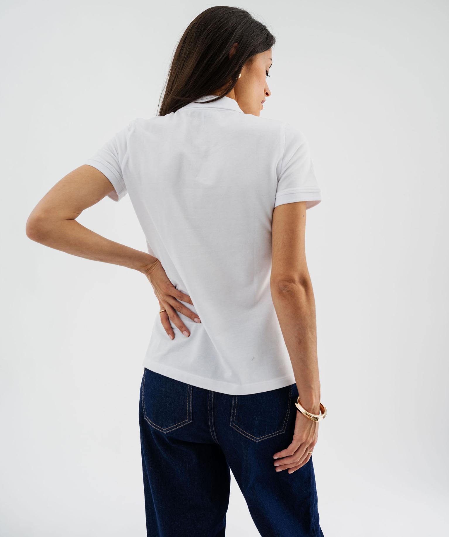 Pièce intemporelle du vestiaire des femmes, le polo à manches courtes en coton piqué. Une pièce inspirée de l’univers sportif, qui trouve sa place dans tous les looks casual chics. Ce polo femme respecte tous les codes du genre avec son col fermé par trois boutons, ses manches terminées par un bord-côte et ses petites fentes sur les côtés. Sa confection 100% coton intégrant du coton recyclé ajoute une note éco-responsable dans le dressing. Ce polo se porte avec un pantalon en toile comme avec une jupe en jean. Bas plus long au dos.