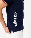 Soutenez les sportifs français avec ce chouette polo "Allez les bleus" ! Un polo homme en maille de coton piquée, floqué sur le côté avec le message "On ne lâche rien" et brodé "Allez les bleus" sur la poitrine. Les finitions en bas de manche sont tricolores pour un petit clin d'œil au drapeau. Coupe droite. Fentes latérales. Dos un peu plus long. Col polo 2 boutons.