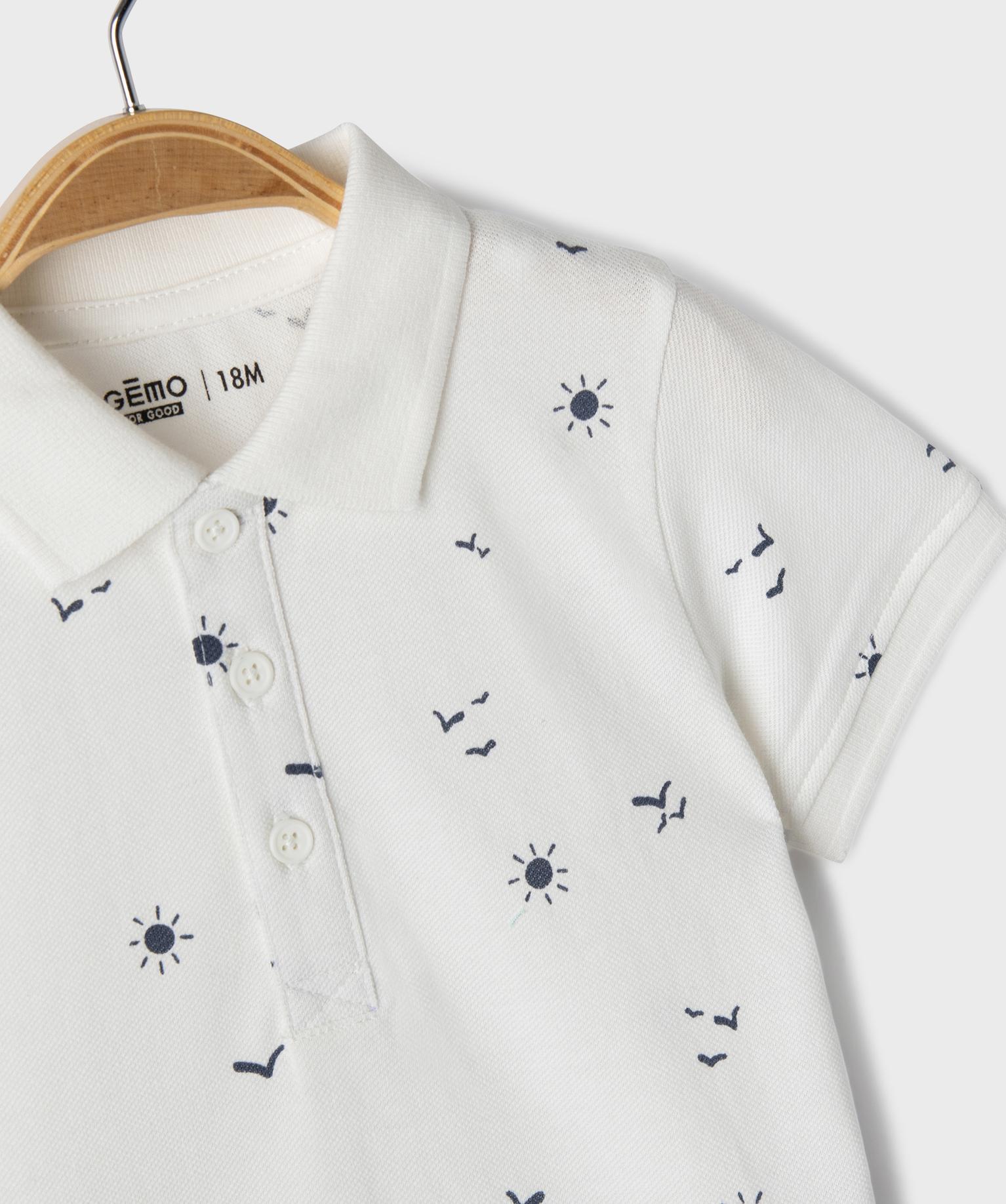 Offrez à votre bébé un look à la fois chic et craquant avec ce polo à manches courtes en maille piquée. Confectionné en coton pour une douceur optimale, le polo bébé garçon arbore des petits motifs graphiques de soleils et d'oiseaux qui apportent une touche d'originalité. Sa coupe droite confortable et ses fentes latérales permettent une grande liberté de mouvement. Pratique, la fermeture au col par 3 boutons facilite l'habillage. On retrouve les finitions en bord-côte uni au col et aux manches pour une tenue impeccable. Un indispensable du vestiaire estivale superbe en association avec un bermuda chino !