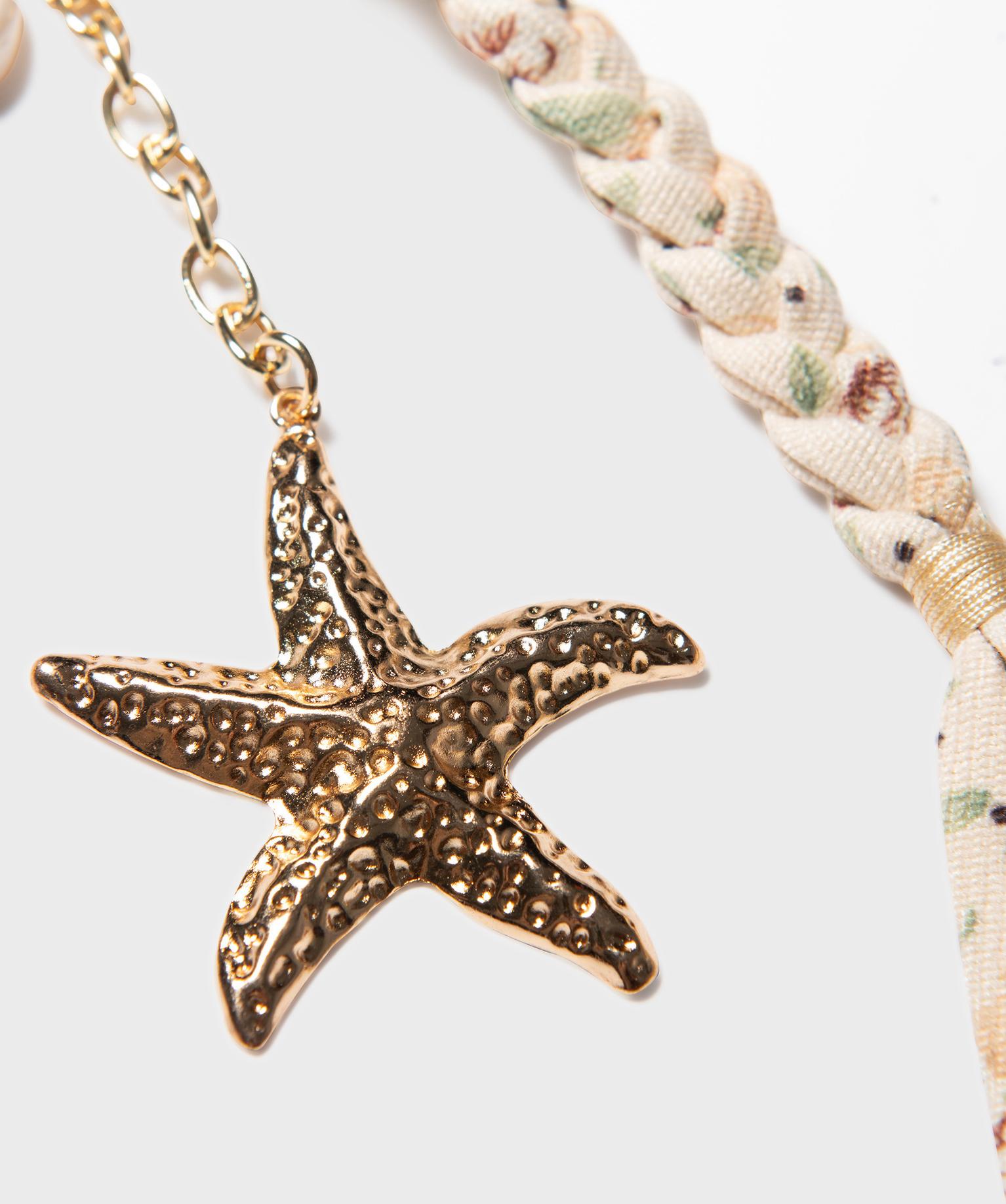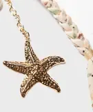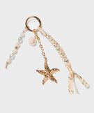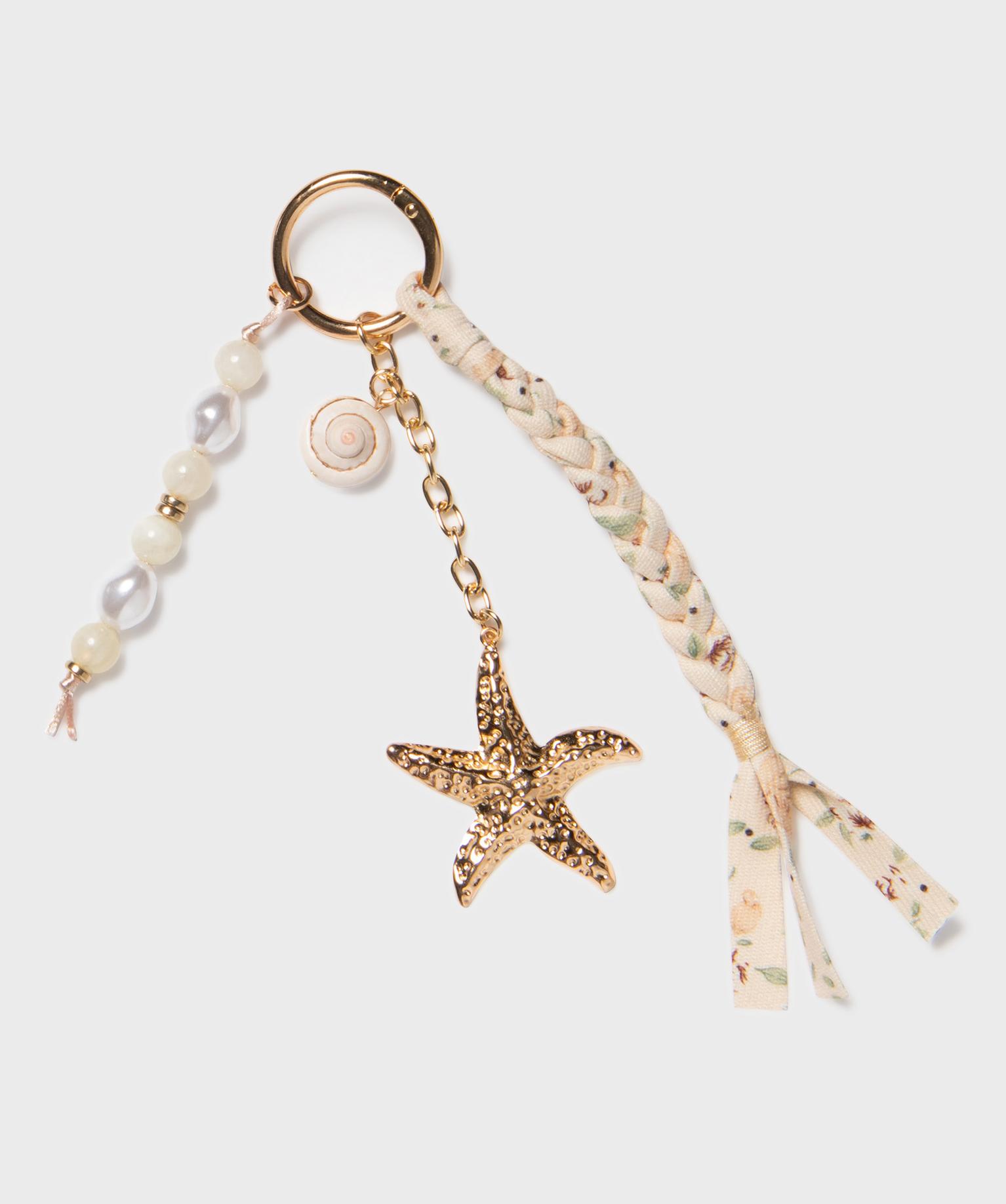 Ce joli porte-clés femme glisse un doux parfum d’évasion dans votre sac à main. Composé d’un anneau mousqueton en métal, il est orné d’une tresse à motifs fleuris, d’une tige en perles aux reflets nacrés et d’une chaine décorée d’un coquillage et d’une étoile de mer. Ses détails raffinés et son inspiration marine en font un accessoire plein de poésie, qui évoque les vacances en bord de mer. Il peut être utilisé comme bijou de sac, accroché à une anse.