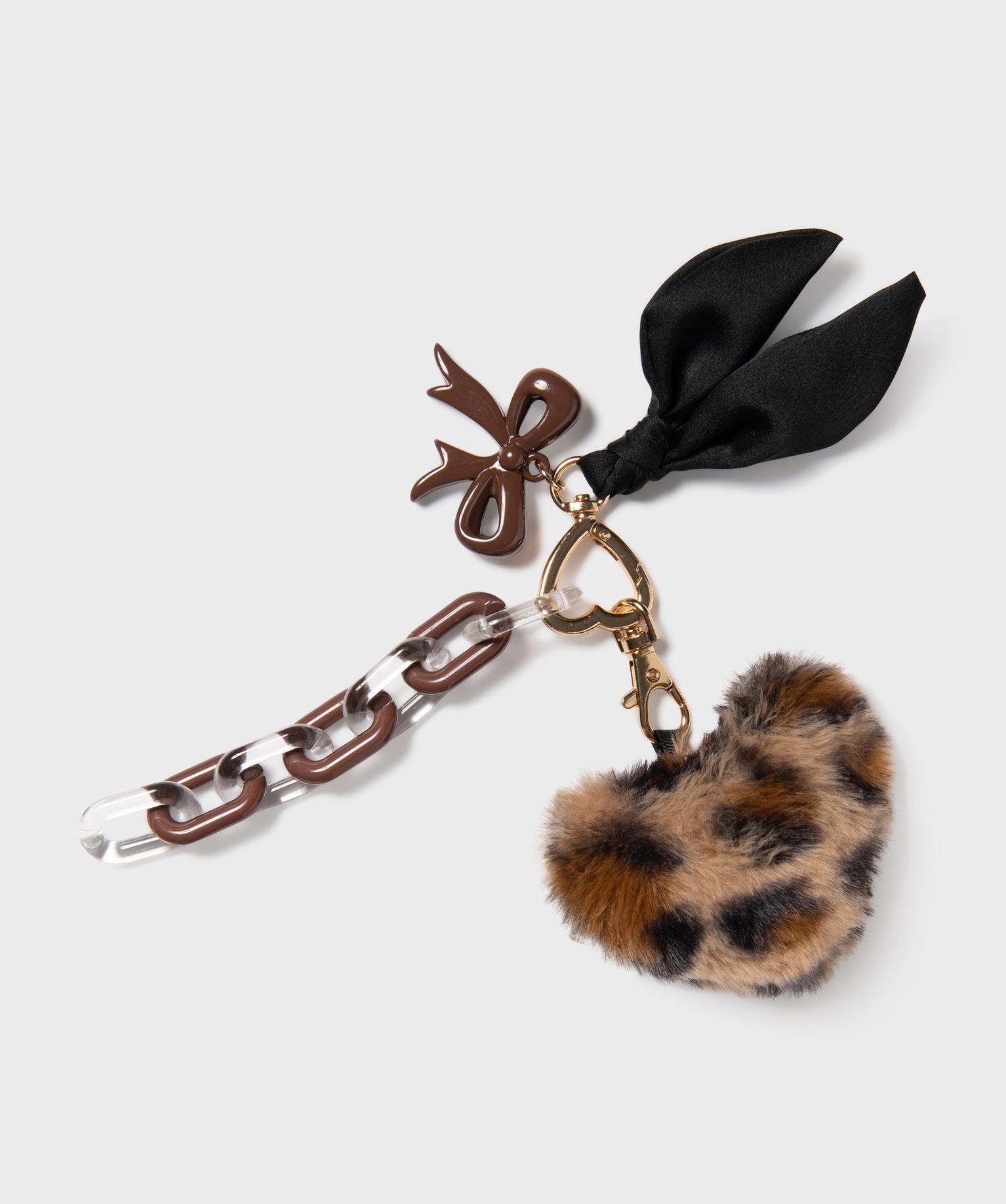Orné de quatre adorables breloques, ce porte-clés insuffle une touche de style et de bonne humeur à votre quotidien. À la fois pratique et décoratif, il habille vos clés ou votre sac d’une note ludique et tendance. Ce porte-clés femme se compose d’un mousqueton en forme de cœur et de quatre breloques : un cœur en peluche à motif léopard, une chaîne bicolore en résine, un nœud en satin et un nœud en résine. Un accessoire plein de charme, parfait pour personnaliser vos essentiels avec originalité.