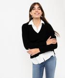 Retrouvez l’élégance décontractée du pull porté sur une chemise mais en une seule pièce grâce à ce pull 2 en 1. Un pull pour femme doté d’un large col en V et d’un col chemise avec empiècements chemise qui dépassent dans le bas. Ce pull séduit également par sa composition plus responsable, il est confectionné à partir de polyester recyclé et contient une touche de laine pour plus de chaleur. Coupe ample, épaules tombantes, ce pull chemise trouve sa place dans tous les looks décontractés. Bas fendu sur les côtés.