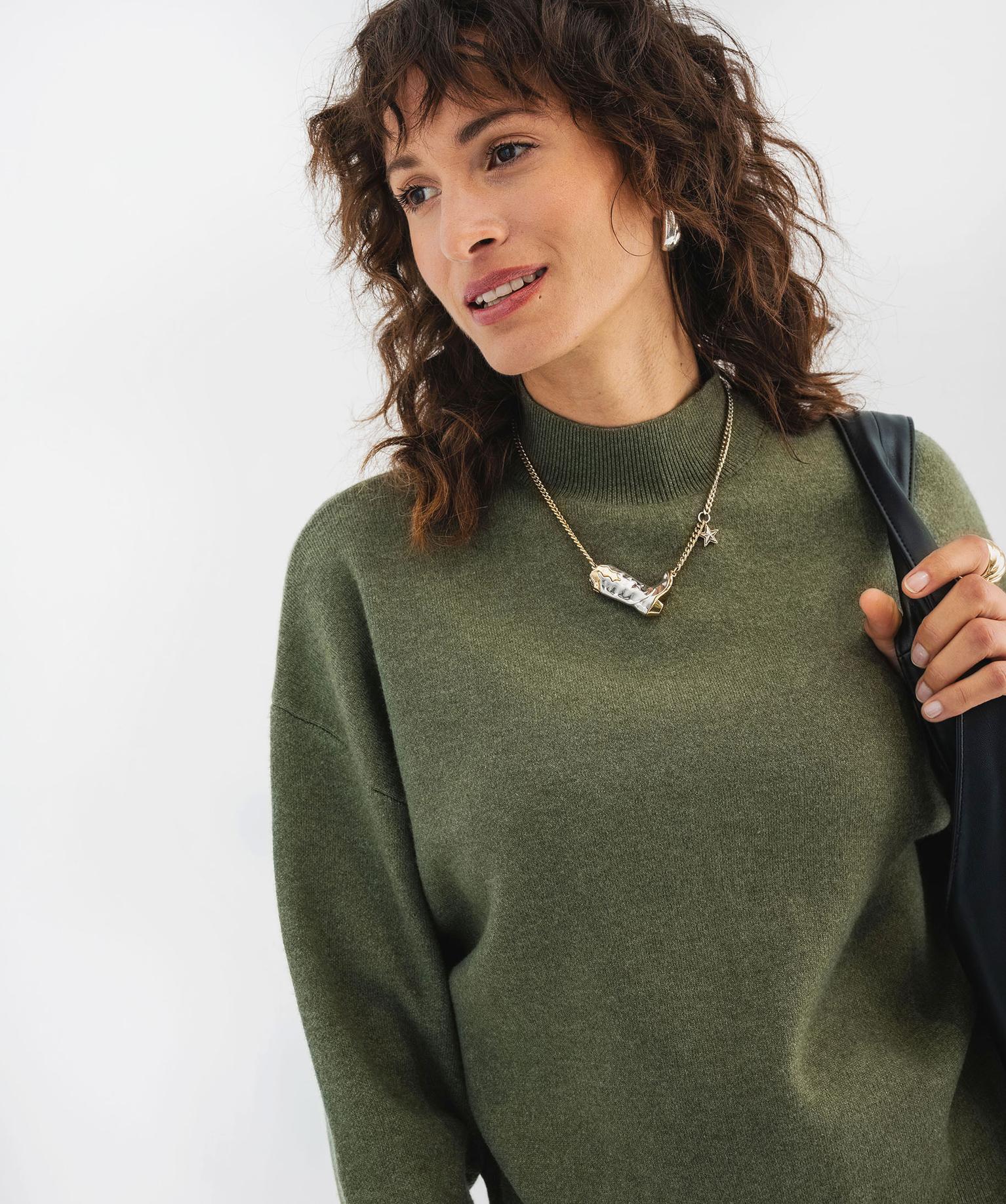 Adoptez une allure à la fois décontractée et féminine grâce à ce pull coupe loose avec épaules tombantes. Un pull pour femme confectionné majoritairement en polyester recyclé qui s’inscrit dans une démarche éco-responsable tout en offrant une maille douce et douillette, agréable à porter au quotidien. Ses atouts ? Une coupe courte et ample pour une silhouette moderne, un petit col montant pour une touche élégante et un confort optimal. Facile à associer, ce pull court se porte avec un jean taille haute et des baskets pour un look casual, ou avec une jupe midi et des bottines pour une allure plus chic.