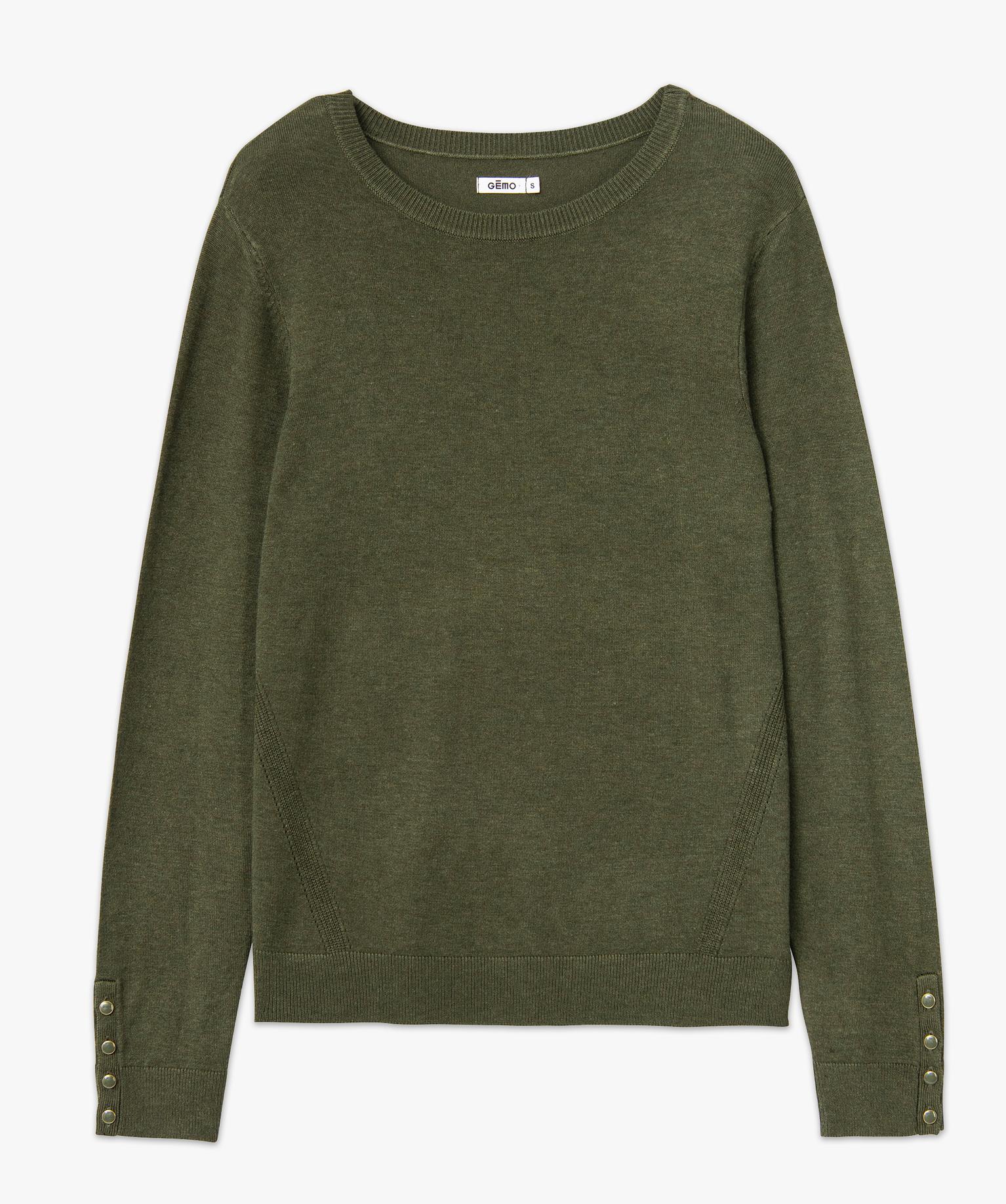 Ce pull fin à col rond vous enveloppera douceur pour un confort absolu tout en vous offrant un style résolument tendance. Sa coupe flatteuse sublimera votre féminité, accentuée par de délicats boutons fantaisie aux poignets et des bandes en maille fantaisie discrètement placées sur les côtés. Ce pull femme est un véritable atout de sophistication pour chacune de vos tenues. Finitions bord-côte au col, aux poignets et dans le bas.