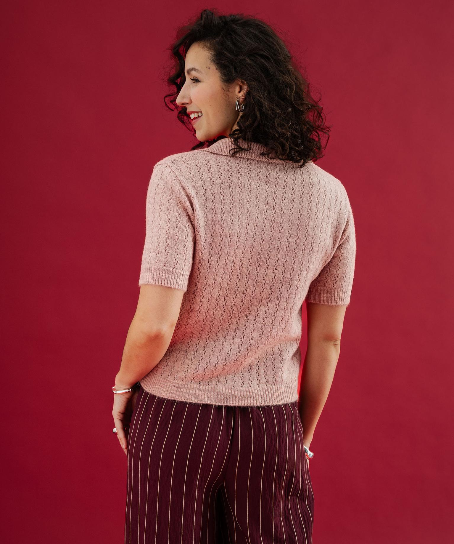 Ajoutez de la douceur à vos looks avec cet élégant pull à manches courtes. Un pull pour femme tricoté dans une jolie maille fantaisie ajourée, douce et confortable. Il possède un col chemise avec décolleté en V, très féminin. Ce pull ajouré, légèrement transparent, se porte sur un top à bretelles. Il s’associe avec une jupe et des slingback pour un look résolument féminin, ou avec un pantalon slim pour une allure casual chic.