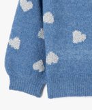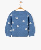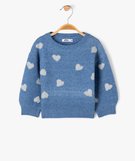 Ce joli pull bébé fille illuminera les tenues du quotidien d’une jolie touche scintillante. Un pull en maille toute douce orné de motifs coeurs en fil métallisé. Il possède des manches larges, avec épaules tombantes, resserrées aux poignets par un bord-côte. Un pull à col rond à porter aussi bien avec un jean qu’avec une jupe à volants.