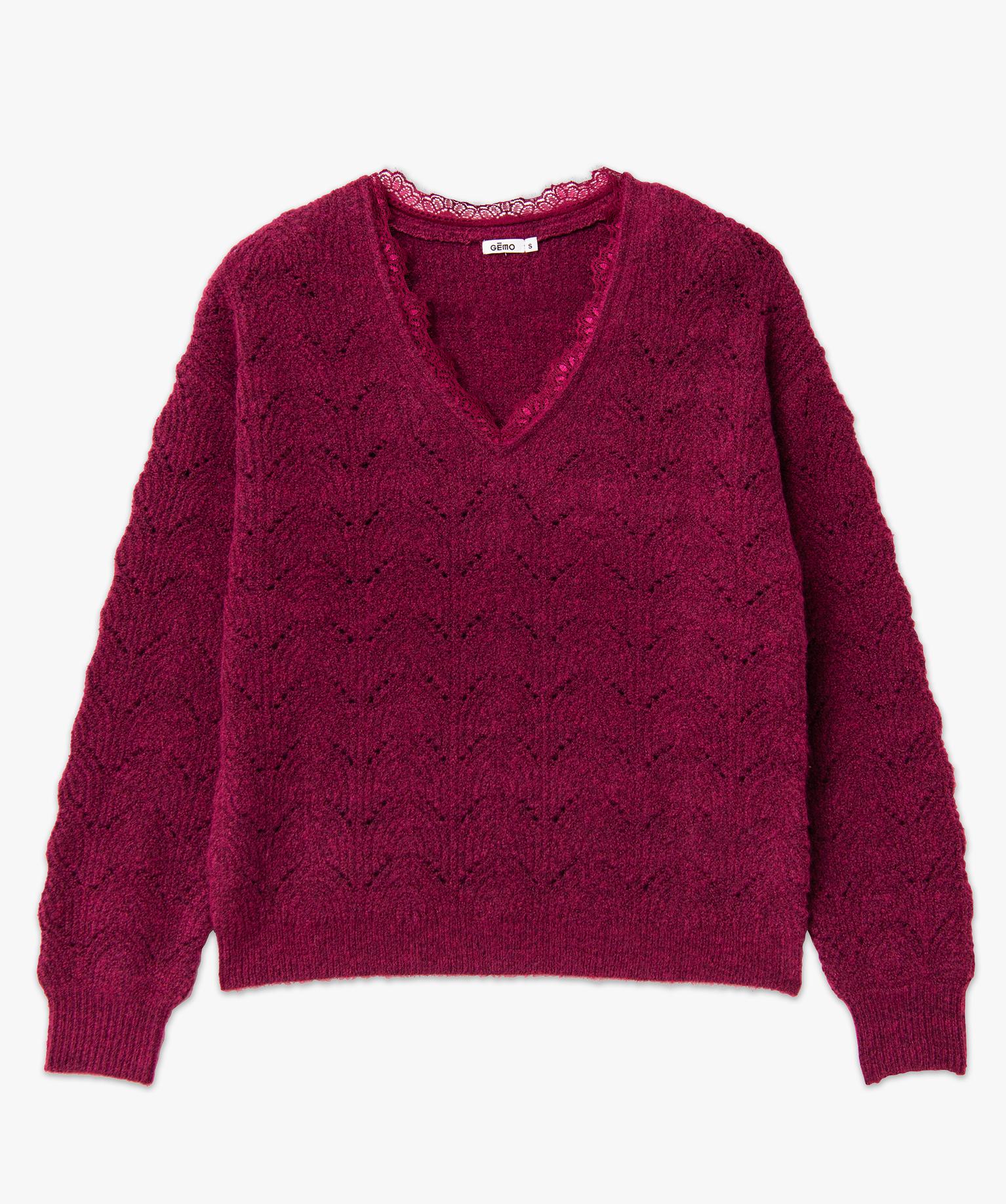 Pull ajouré avec col V en dentelle femme rouge fonce