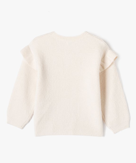 Les filles vont craquer pour ce charmant pull à col rond agrémenté de petits pompons en relief sur l’avant du buste. Ce pull fille est également twisté par de petits volants positionnés sur les épaules qui lui confère une allure ultra girly. Un pull ultra doux qui allie confort et élégance qui accompagnera aussi bien les pantalons que les jupes des filles. Col rond.