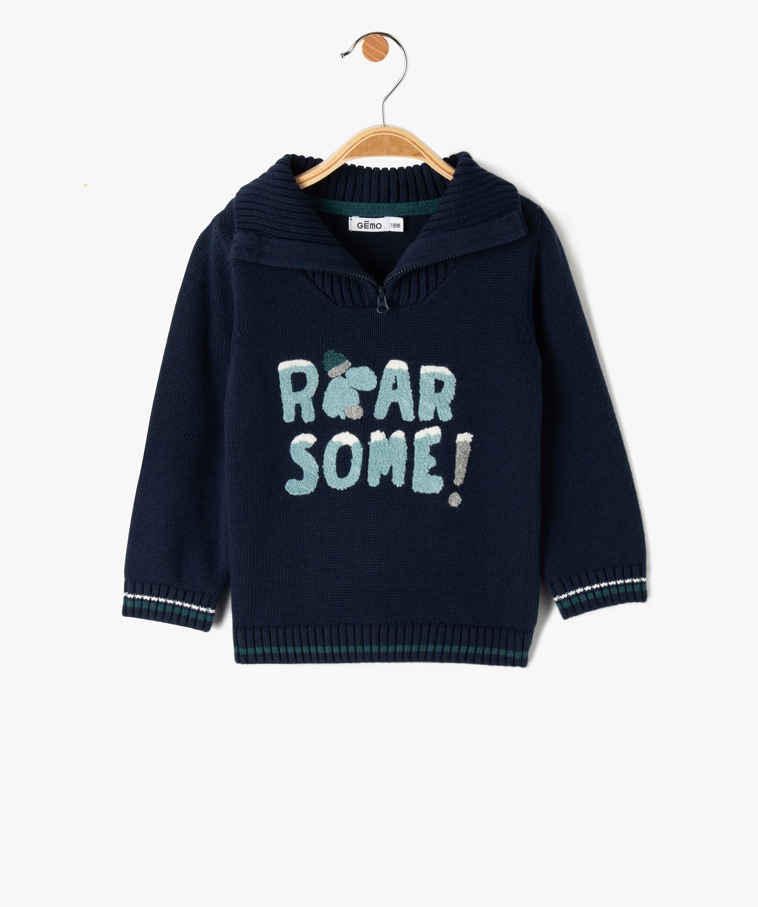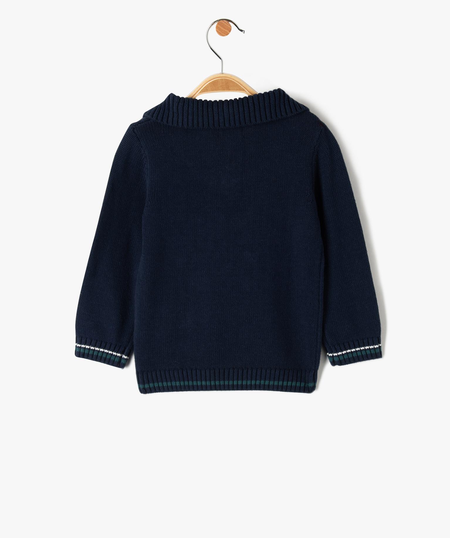 Incontournable des looks casual, le petit pull camionneur ! Avec un jean ou un pantalon en maille, le pull à col zippé donne une allure décontracté et chic à la fois à votre petit garçon. On craque ! On aime le grand motif en maille bouclette sur le devant, ainsi que les fines rayures contrastantes qui soulignent la finition bord-côte aux poignets et dans le bas. Un pull bébé garçon qui s'adaptera à toute la garde-robe.