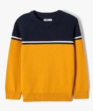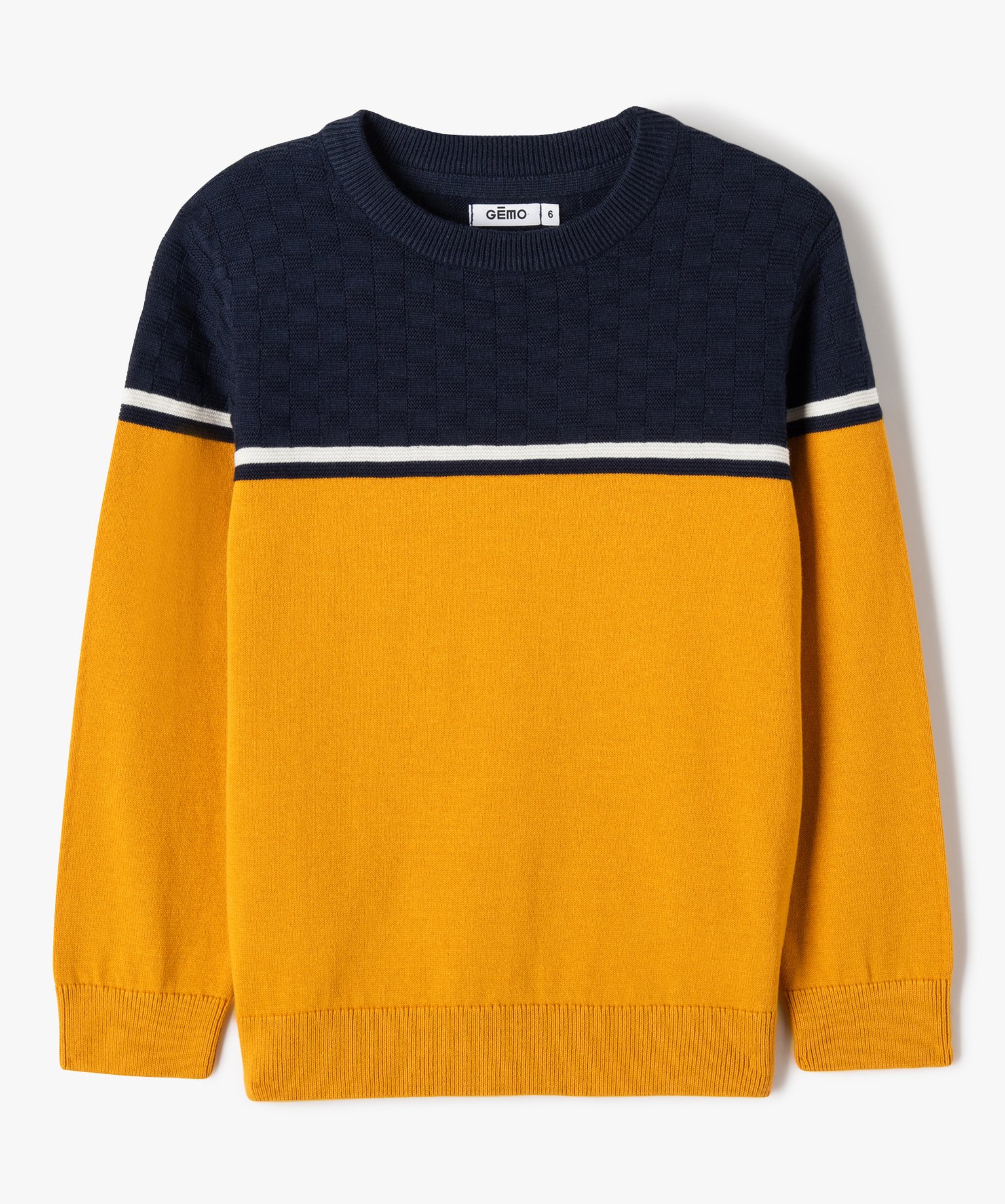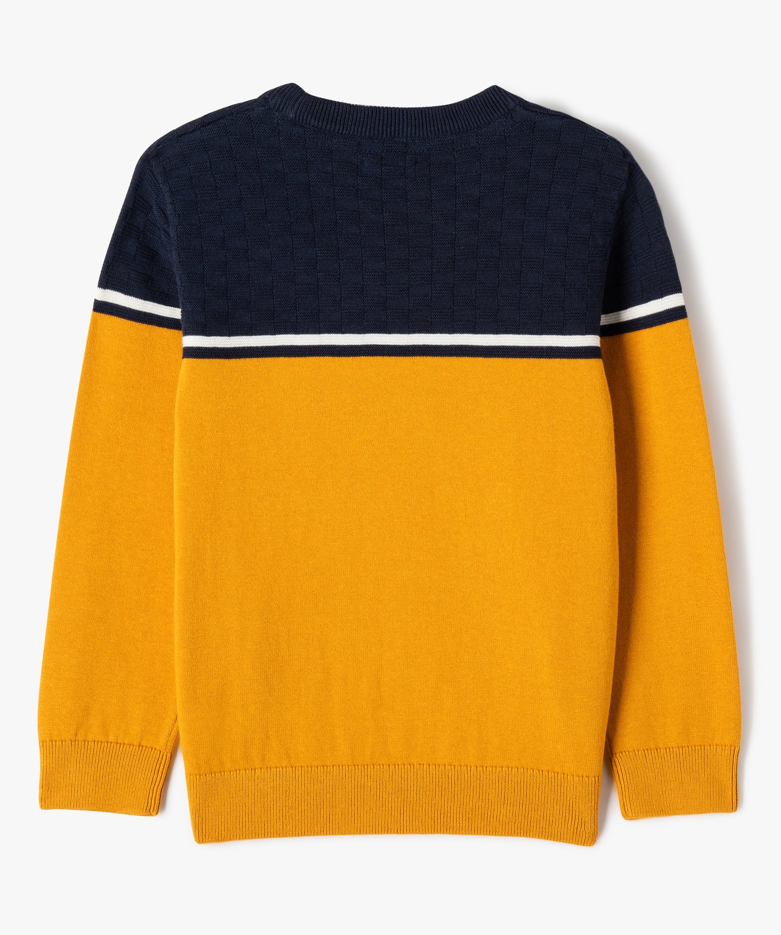 Pull bicolore avec maille fantaisie sur le haut garçon jaune