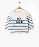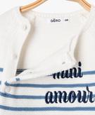 Offrez à votre bébé un premier vêtement à croquer avec ce pull brassière rayé, parfait pour un confort optimal. Le pull de naissance s'inspire de l'intemporelle marinière : il se distingue par ses rayures et son message brodé sur l'avant. L'ouverture intégrale par une rangée de boutons sur le côté facilite l'habillage. Doté d'emmanchures raglan et d'une coupe droite assez ample, il est conçu pour offrir un maximum de confort à votre tout-petit. 100% coton doux, il est idéal pour la peau délicate des tout-petits.