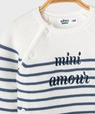 Offrez à votre bébé un premier vêtement à croquer avec ce pull brassière rayé, parfait pour un confort optimal. Le pull de naissance s'inspire de l'intemporelle marinière : il se distingue par ses rayures et son message brodé sur l'avant. L'ouverture intégrale par une rangée de boutons sur le côté facilite l'habillage. Doté d'emmanchures raglan et d'une coupe droite assez ample, il est conçu pour offrir un maximum de confort à votre tout-petit. 100% coton doux, il est idéal pour la peau délicate des tout-petits.