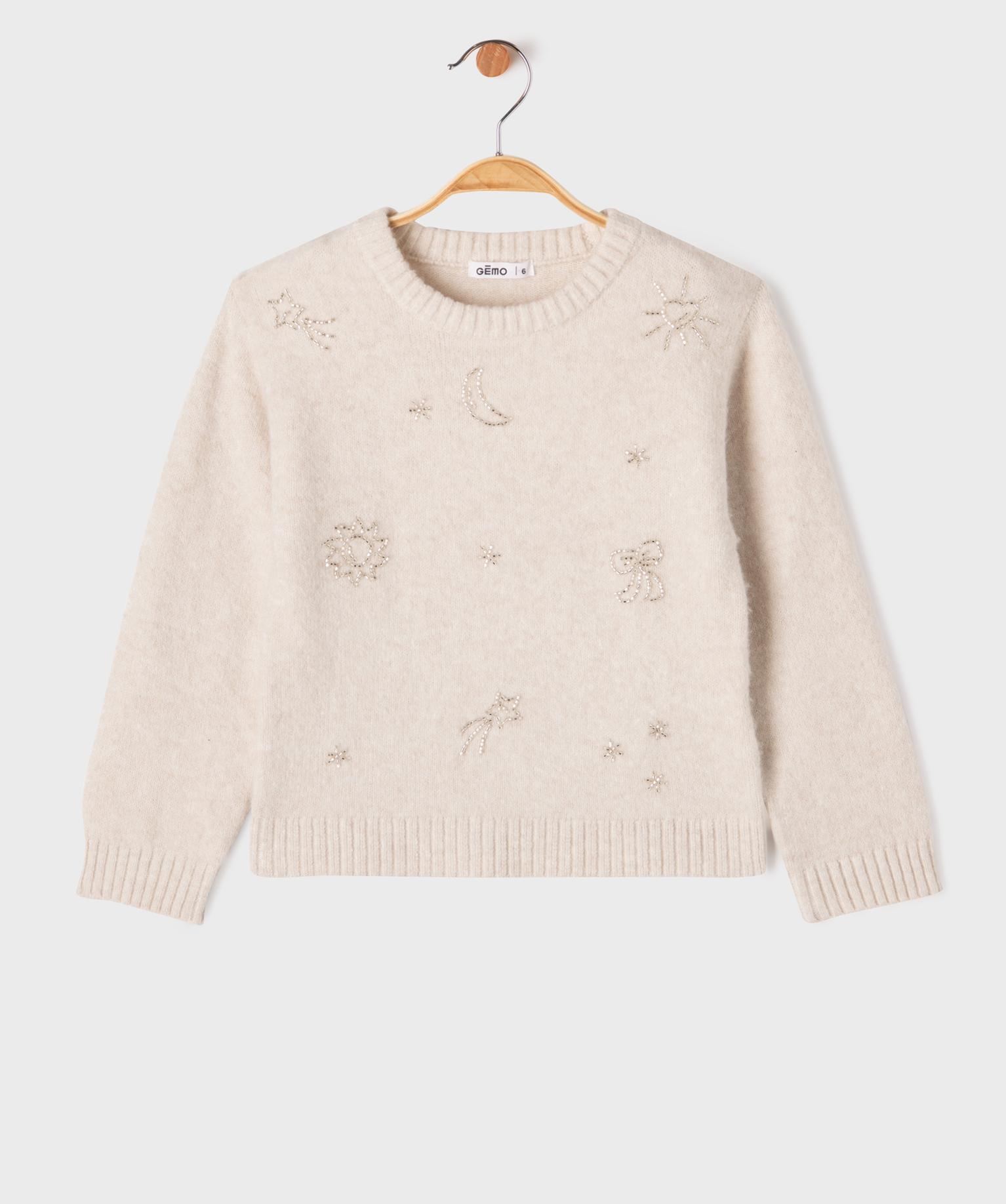Le petit pull douillet parfait pour les fillettes qui aiment les paillettes ! Ce ravissant pull en maille douce et extensible est brodé sur l'avant de motifs célestes en perles argentés. De quoi mettre une belle touche d'éclat aux tenues du quotidien... parfait pour réchauffer une tenue de fête ! Le pull pour fille présente une coupe droite confortable, avec un col rond et une finition côtelée classique.