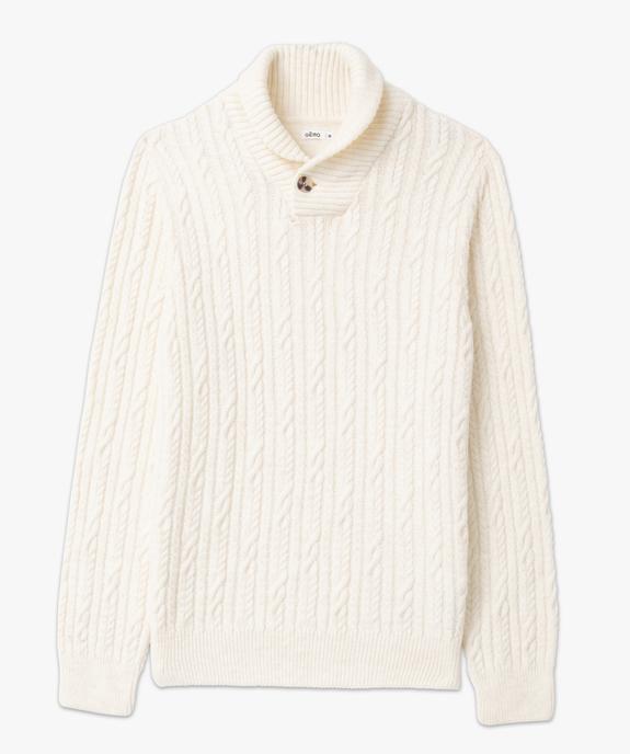 Finition côtelée au col, aux poignets et dans le bas. Col châle avec fermeture 1 bouton imitation écaille. Torsades devant et aux manches.