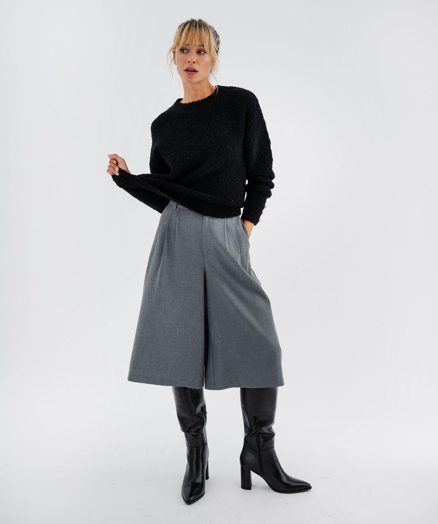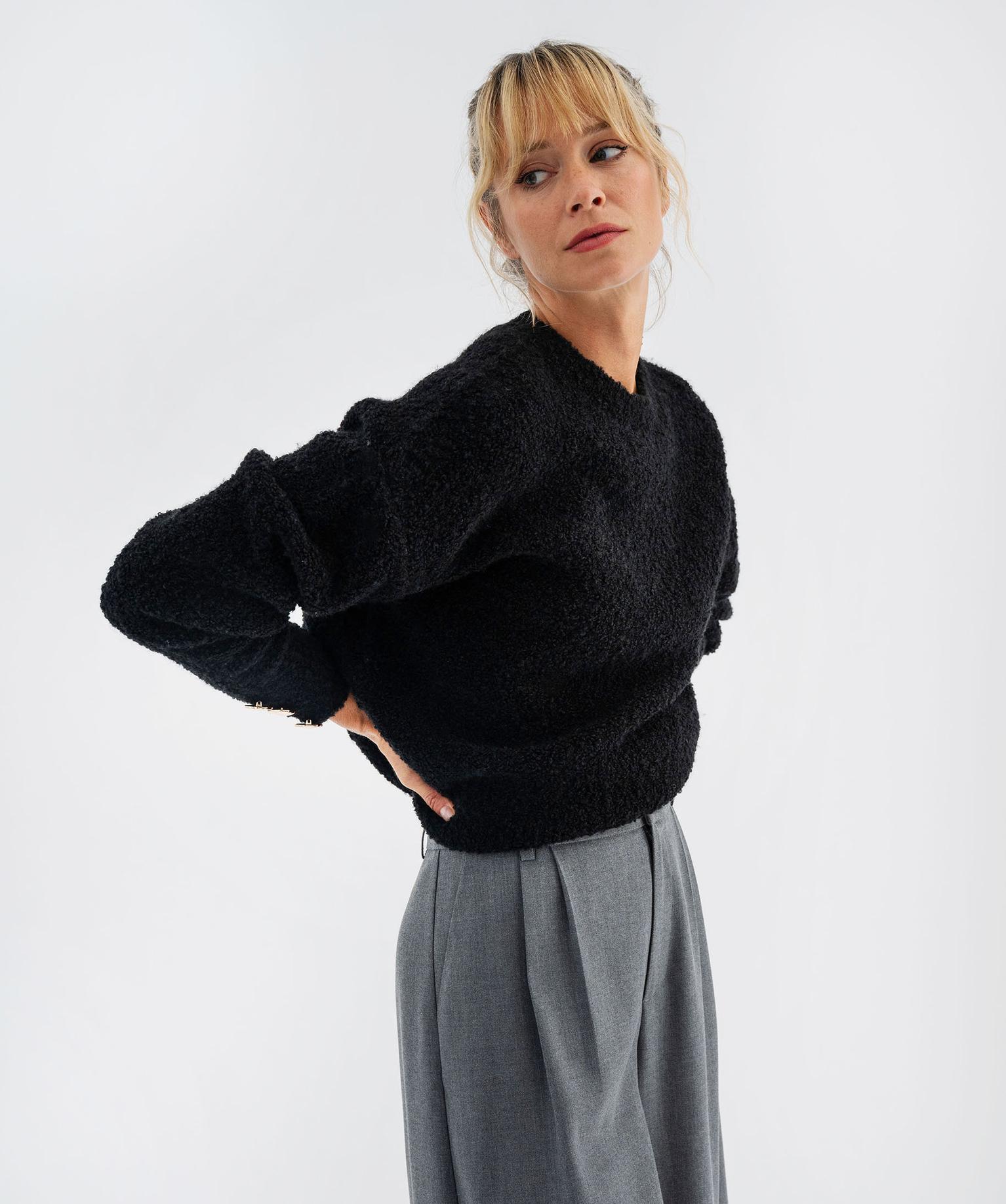 Ce joli pull pour femme allie confort, chaleur et élégance grâce à sa maille bouclette enrichie d’une touche de laine. Sa coupe loose, accentuée par des épaules tombantes, lui donne une allure décontractée tout en restant féminine. Les poignets sont délicatement rehaussés de jolis boutons dorés, apportant une note chic et raffinée. Facile à porter au quotidien, ce pull douillet se marie aussi bien avec un jean casual qu’une jupe élégante pour un look à la fois cosy et tendance.