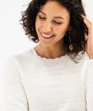 Ce joli pull en maille fine ajoutera une touche de raffinement à votre garde-robe estivale. Conçu pour allier élégance et légèreté, ce pull femme, majoritairement composé de viscose, est tricoté dans une maille fantaisie alternant rayures en relief et bandes ajourées. Le col, orné de finitions dentelées, apporte une note féminine subtile qui rehausse l’ensemble. Un pull d’été idéal à porter avec une jupe fluide pour un look romantique ou glissé dans un jean taille haute pour une allure casual-chic. Finitions bord-côte.