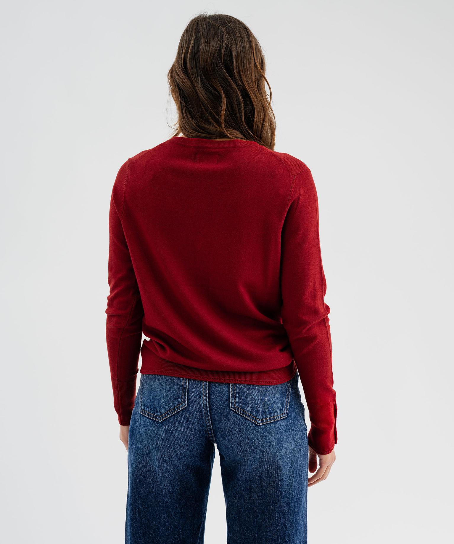 Avec son col V flatteur, ce pull en maille douce est un véritable essentiel. Sa coupe droite légèrement ajustée met en valeur la silhouette sans la contraindre. Il se porte aussi bien seul à même la peau que par-dessus un body ou une chemise. Les boutons décoratifs aux poignets ajoutent une note raffinée. Uni, classique, facile à assortir, le pull femme se porte aussi bien avec un jean qu’un pantalon habillé.