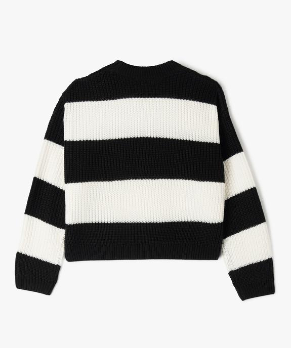 Ultra tendance, le pull court en grosse maille s'associe à tous les bas du dressing de votre ado, pour un maximum de style ! Le pull fille est tricoté dans une maille souple et touche et affiche de larges rayures contrastantes. On adore sa forme boxy, casual et moderne, à porter seule ou en superposition d'une chemise par exemple. Pull à emmanchures tombantes. Col rond. Finition bord-côte.