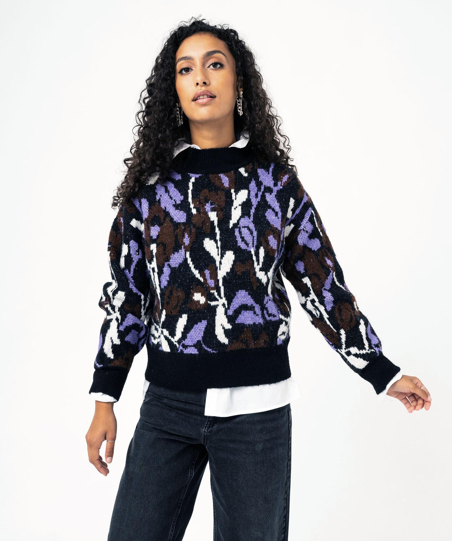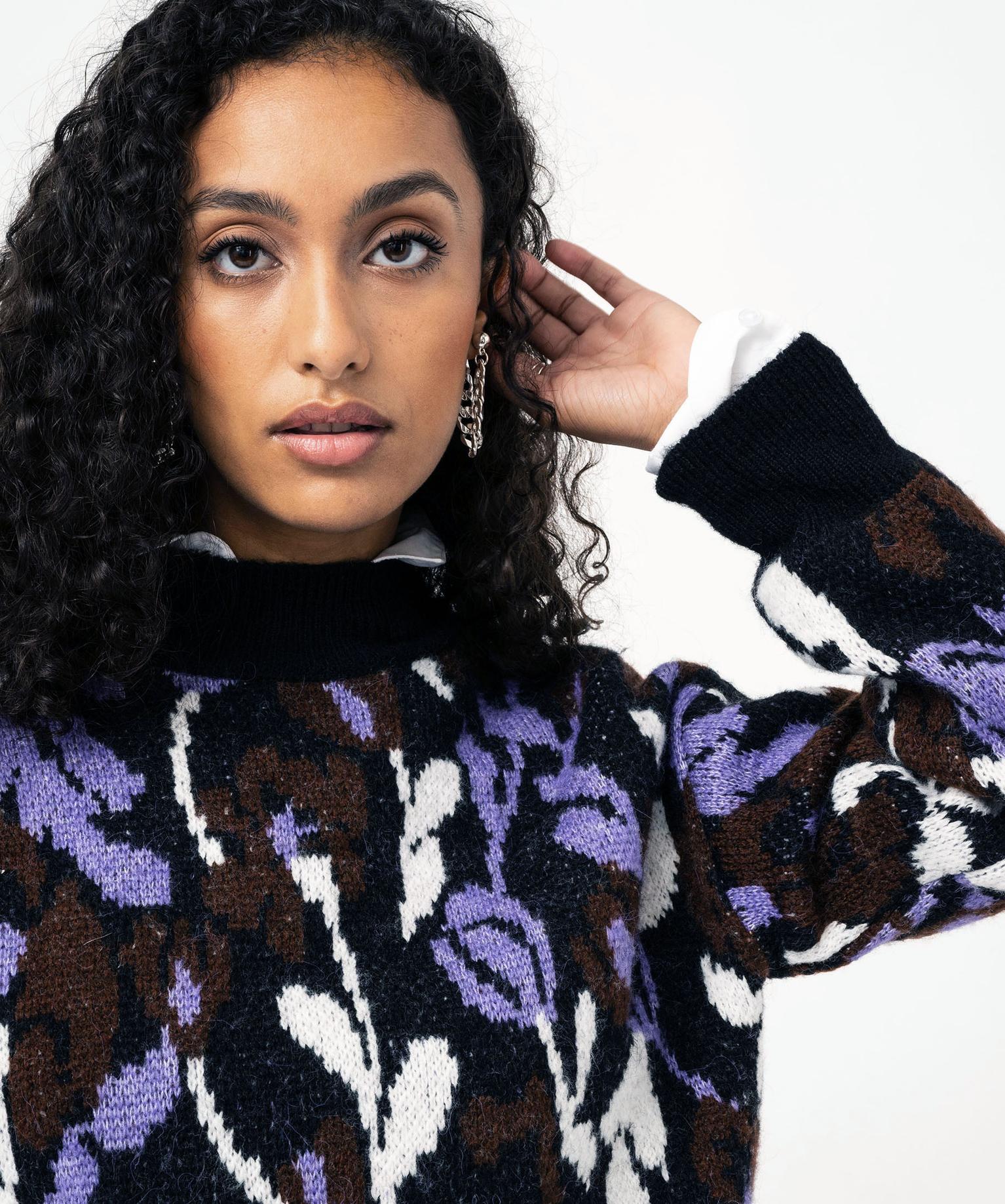 Pull imprimé jacquard. Finition côtelée unie au col, aux poignets et dans le bas. Col légèrement montant.