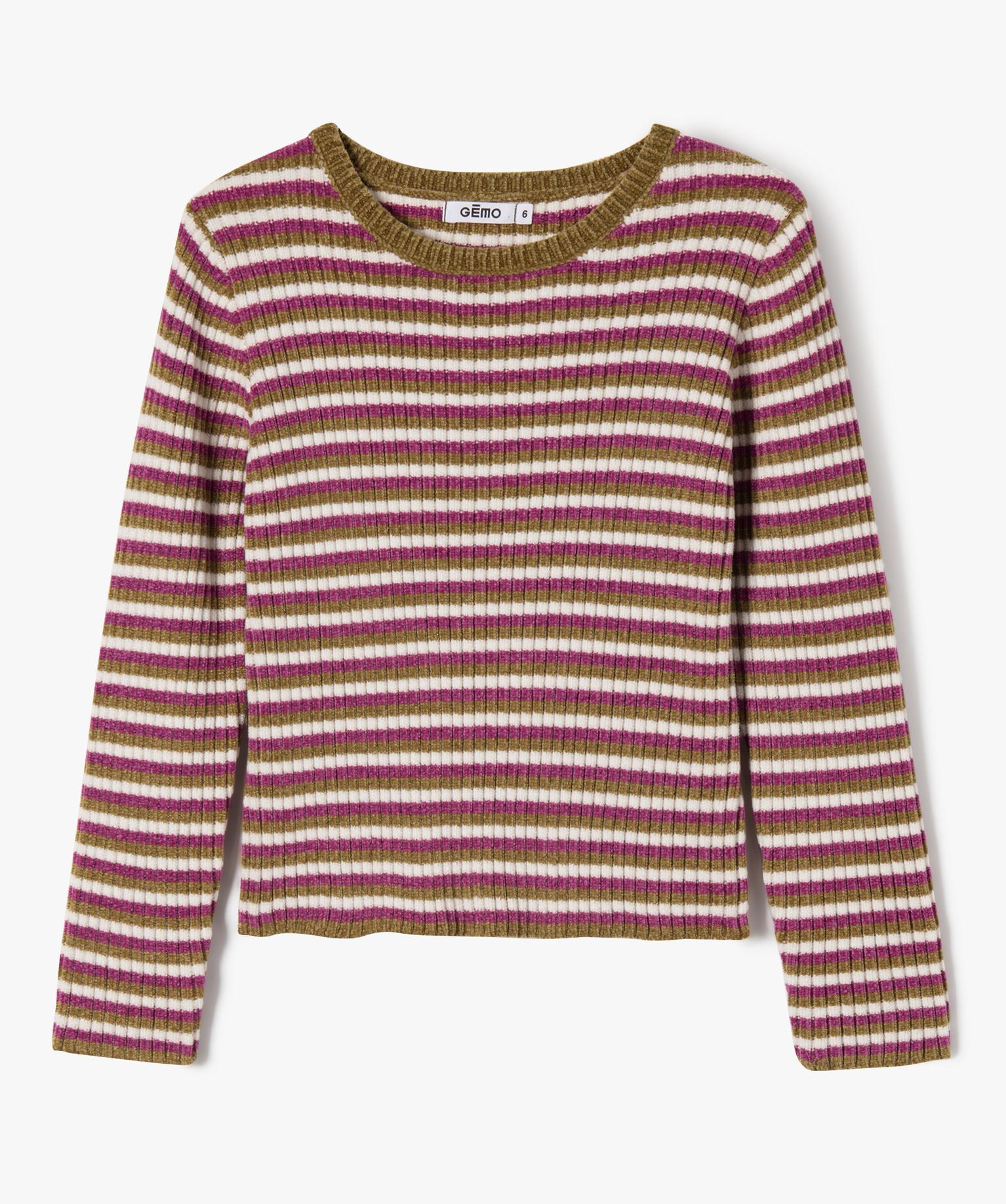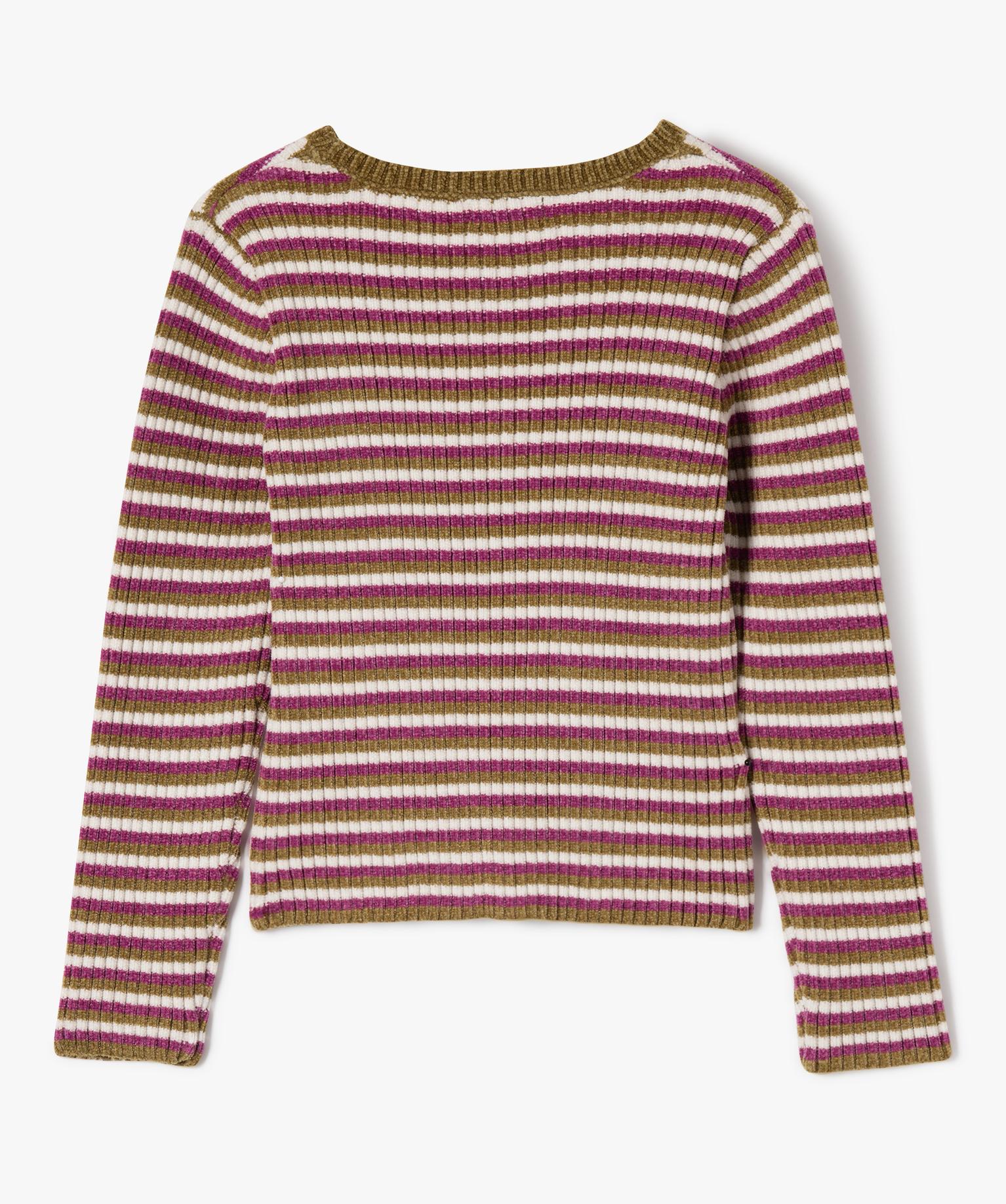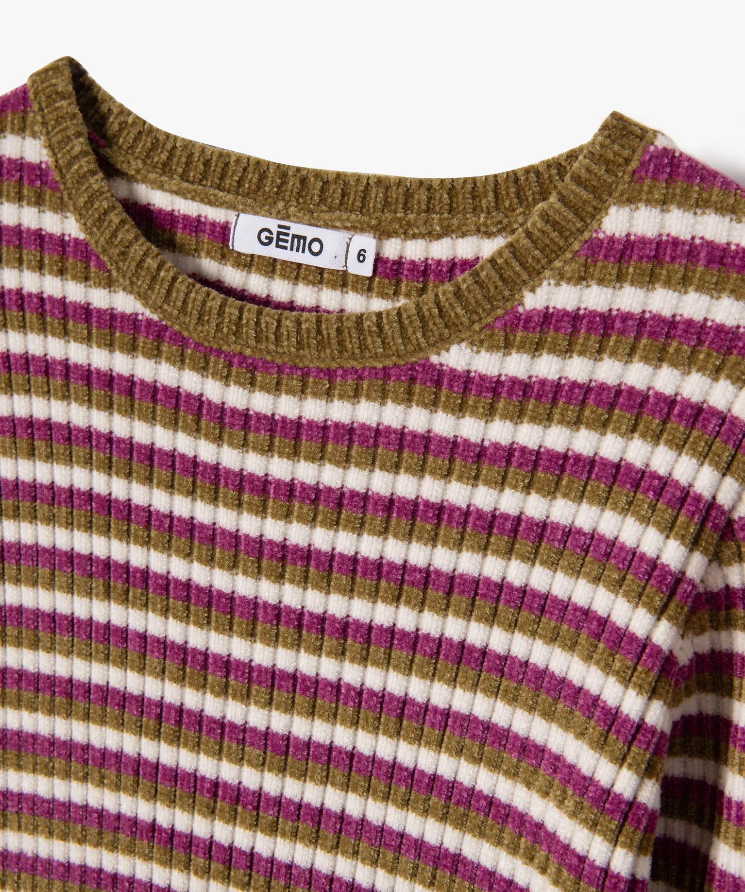 Ce joli pull rayé enveloppera les petites filles de douceur grâce à sa maille chenille si confortable. Un pull fille en maille côtelée avec col rond souligné par un biais uni, qui ajoutera une touche rétro dans le vestiaire des enfants. Facile à porter, ce pull court s’accorde aussi bien avec une jupe qu’avec un pantalon ou une salopette tout en leur ajoutant une note colorée et pétillante.