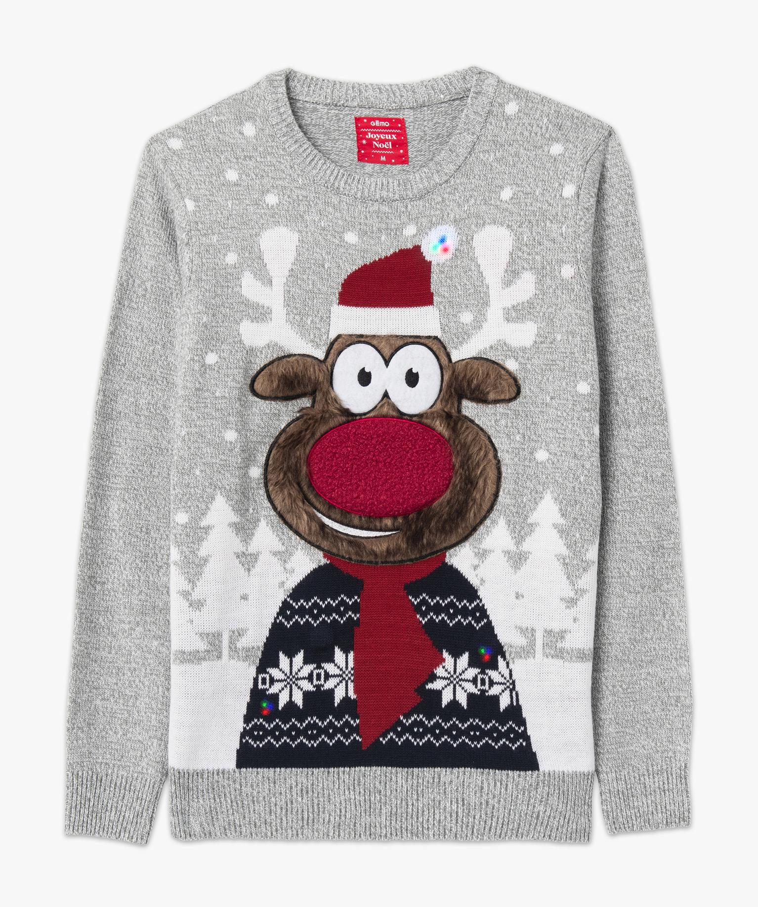 Vous allez adorer cet incroyable pull de Noël pour homme ! Un pull chiné douillet qui doit tout son charme et sa fantaisie à son grand motif renne en maille peluche et bouclette avec lumières clignotantes ! Ce pull lumineux vous garantit un look remarquable et unique pour les fêtes de fin d’année ! Finition côtelée au col, aux poignets et dans le bas. Dos uni.