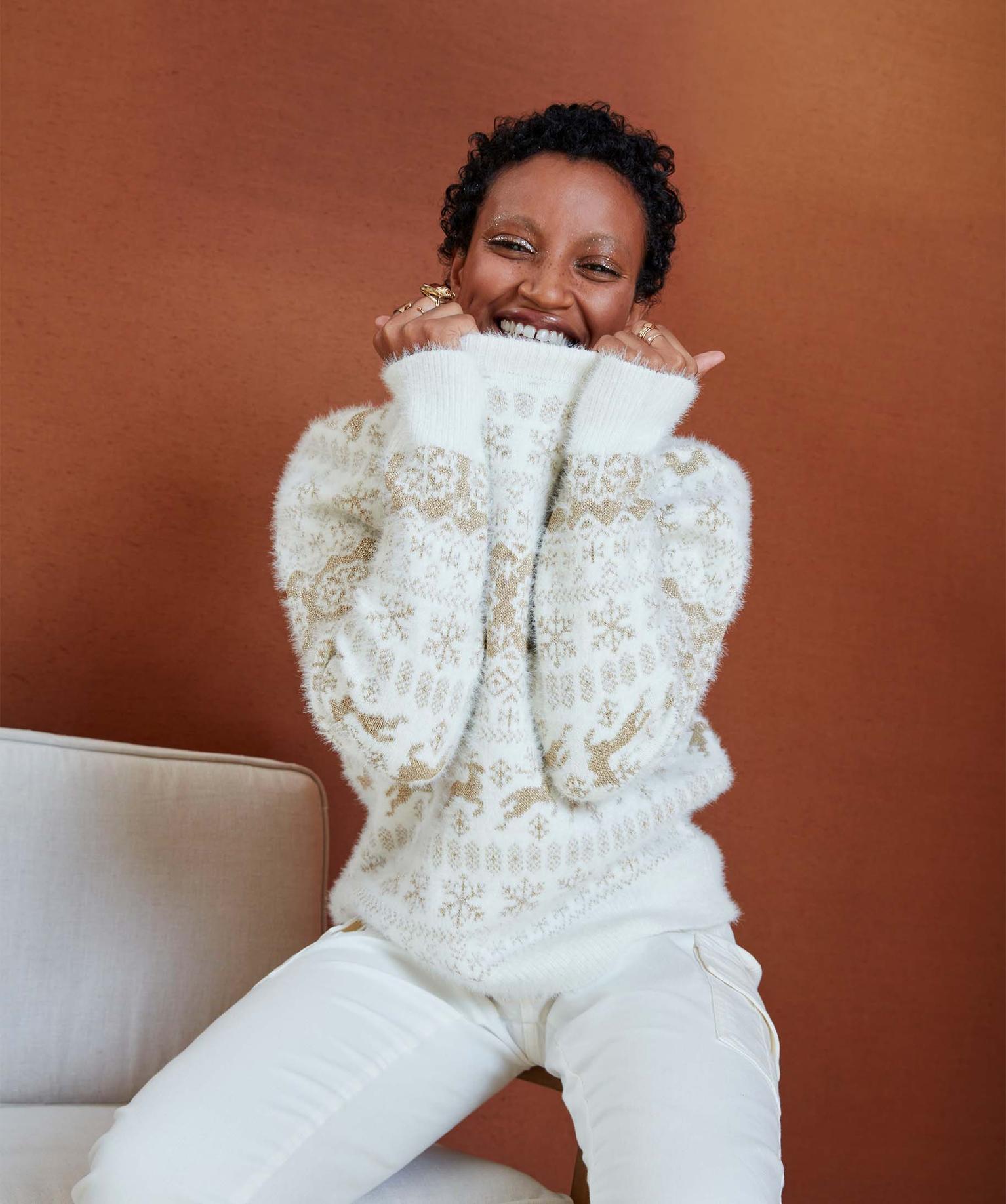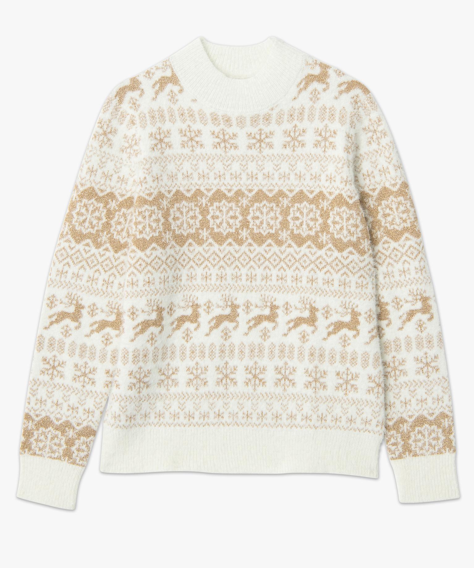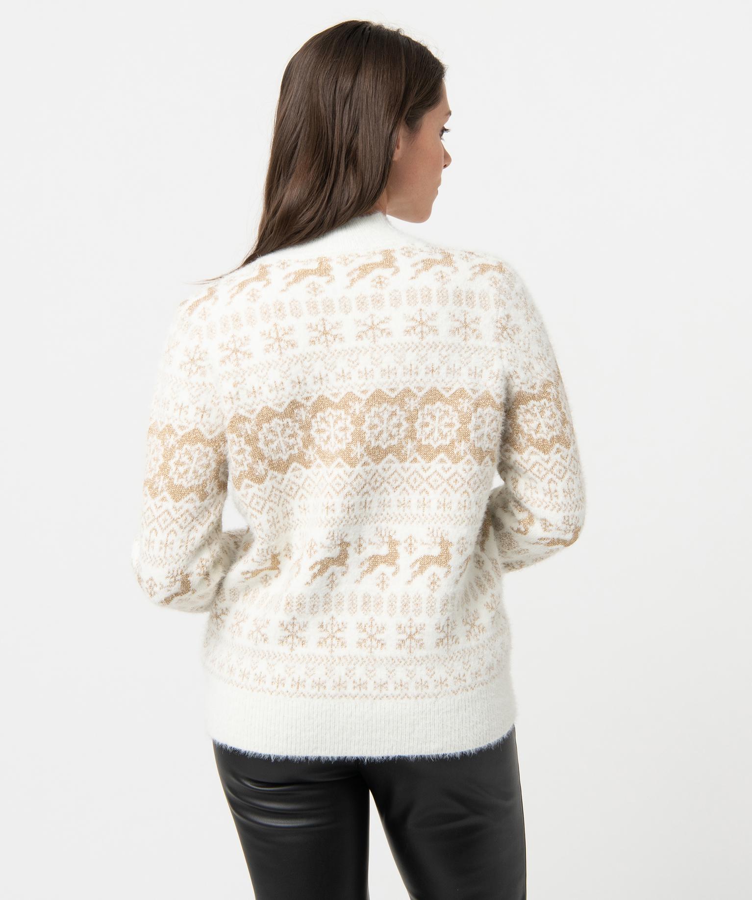 Une maille épaisse, douillette et toute douce, un col légèrement montant, des motifs rennes et étoiles de neige inspirés par la saison, du doré pour l'esprit festif : voilà un pull jacquard qui trouvera facilement sa place dans votre dressing hivernal ! Dès le premier coup d'œil, vous serez séduite par son charme, son élégance et sa décontraction. Un pull femme à porter aussi bien avec un jean qu'une jupe en lamé comme tenue de fête de fin d'année. Finition bord-côte au col, aux poignets et dans le bas.