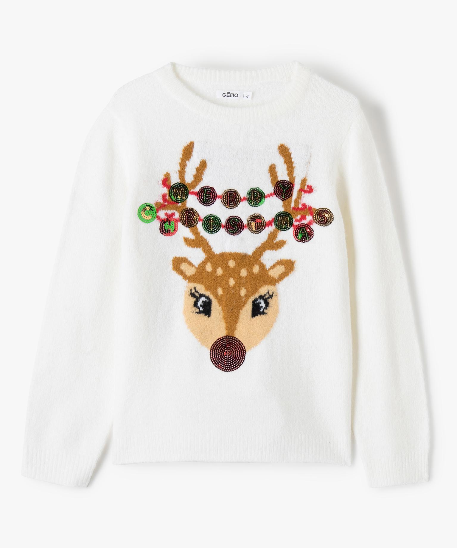 Voilà un pull de Noël qui mettra tout le monde d'accord : il est remarquable ! Les fillettes seront d'abord séduites par sa matière moelleuse et douce, son motif renne et ses touches de sequins brillants. Puis, elles ne voudront plus le quitter quand elles découvriront que le pull clignote ! En effet, le modèle est doté de 3 LED intégrées qui s'allument au toucher. Les lumières bleues, vertes et rouges dansent joyeusement au-dessus de la tête du cerf. Ce pull fille sera parfait comme tenue de fête ou cadeau de Noël rigolo. Finition bord-côte au col, aux poignets et dans le bas. Dos uni.