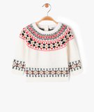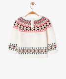 Un ravissant pull de noël, d'hiver, chaud et confortable, idéal pour composer des tenues douillettes. Le pull bébé fille se mariera à merveille avec un short en velours, une jupe en molleton ou un pantalon en maille. Avec son motif relevé de fil pailleté doré, ce pull jacquard concourra également à créer une jolie tenue de fête avec une jupe tutu par exemple. On aime sa maille moelleuse et extensible, ses manches raglan et ses deux boutons dans le haut du dos pour faciliter l'habillage.