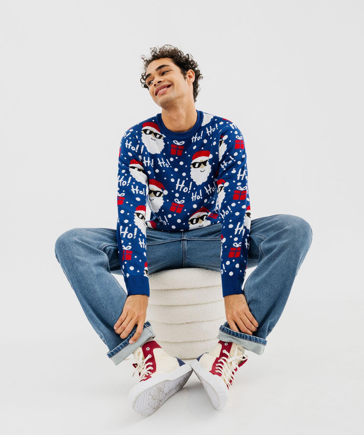 Plongez dans la magie des fêtes avec ce pull de Noël homme ! Son motif jacquard all-over festif mêle têtes de Père Noël, paquets cadeaux, boules de neige et inscriptions "ho ho ho" pour une grosse dose de bonne humeur. Sa coupe classique et son col rond en font une pièce confortable, idéale pour égayer vos tenues de de fêtes ! Finition côtelée au col, aux poignets et dans le bas.