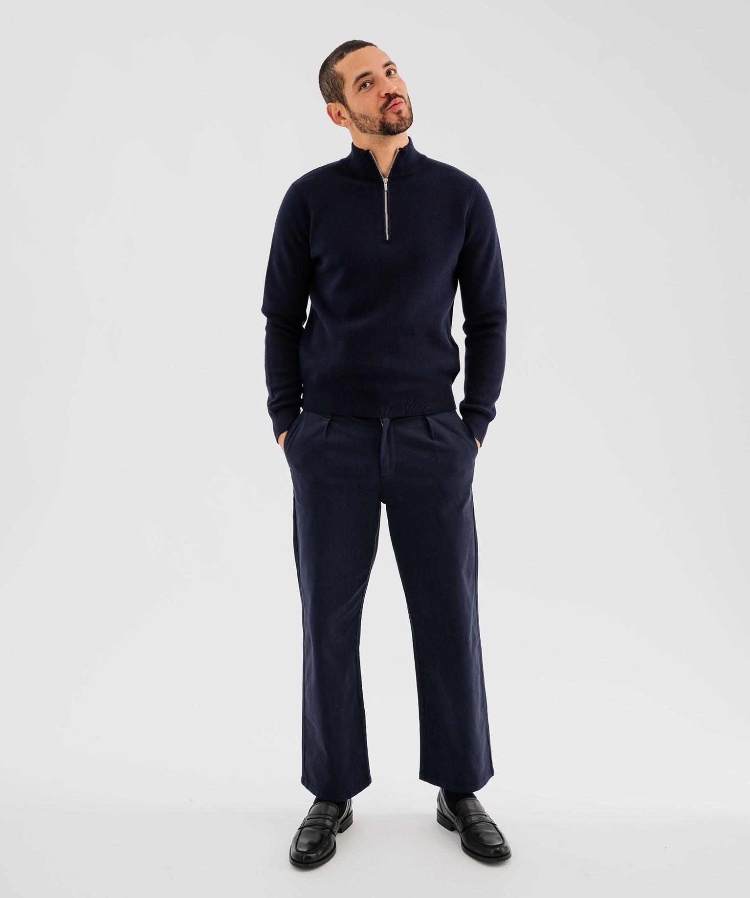 Pour réchauffer les looks de l’été tout en y ajoutant une note décontractée, optez pour le pull en coton. Ce pull pour homme possède un col montant zippé permettant de moduler le décolleté au gré des envies. Il affiche une coupe droite confortable et des finitions en bord-côte aux poignets et dans le bas. Ce pull à col camionneur s'impose comme un basique intemporel et indispensable pour compléter les tenues estivales avec style, qu’il soit porté seul ou superposé à un tee-shirt pour un look casual et soigné.