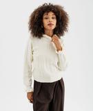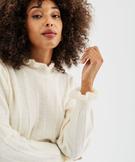 Ce joli pull pour femme apportera une note romantique et chic aux tenues du quotidien. Orné de bandes verticales en maille ajourée, il offre un subtil jeu de transparence et de légèreté. Ce pull uni se distingue par ses finitions froncées sur le col et aux poignets, dans un esprit baroque sophistiqué. Il se porte avec un jean slim et une paire de bottes comme avec une jupe droite et des escarpins.