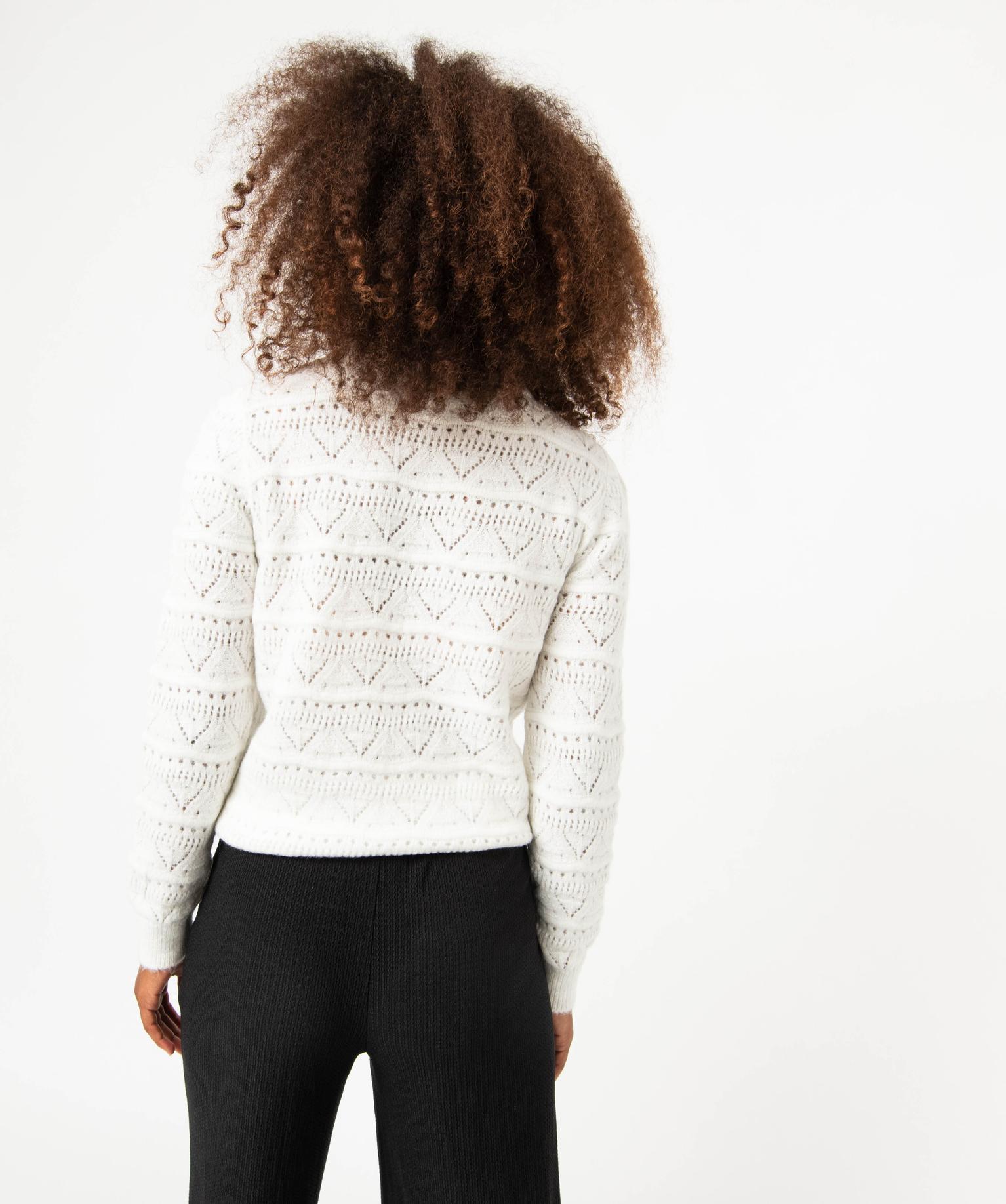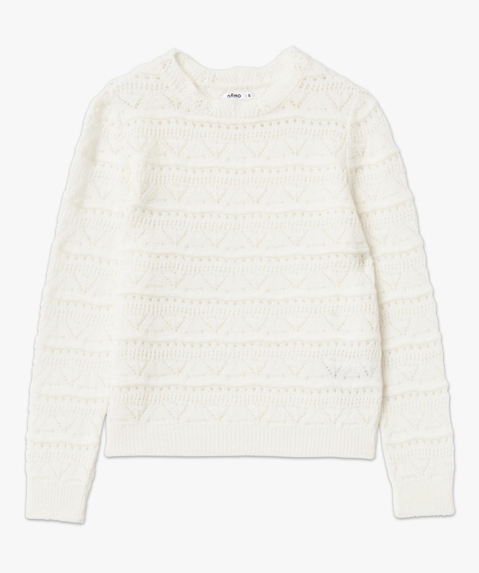 Ce pull en maille vous assurera un maximum de confort et d’élégance. Un pull femme tricoté dans une maille fantaisie ajourée offrant un bel effet de transparence. Son col rond aux finitions dentelées rehausse gracieusement la silhouette. Un pull ajouré à en solo ou superposé sur une chemise. Finitions bord-côte aux poignets et dans le bas.