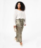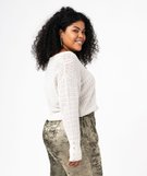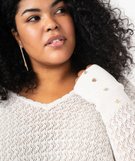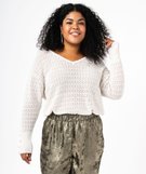 Beaucoup de glamour et d'élégance pour ce pull femme grande taille (du 46/48 au 54/56) ! Confectionné dans une fine maille ajourée douce incrusté de fil doré, il laisse entrevoir votre peau, vos dessous ou un petit caraco… à vous de choisir. On aime son grand décolleté V et ses poignets resserrés accessoirisés de petits boutons dorés factices. Un pull scintillant et sensuel, idéal pour donner du caractère à un jean ou pour composer une tenue de fête.