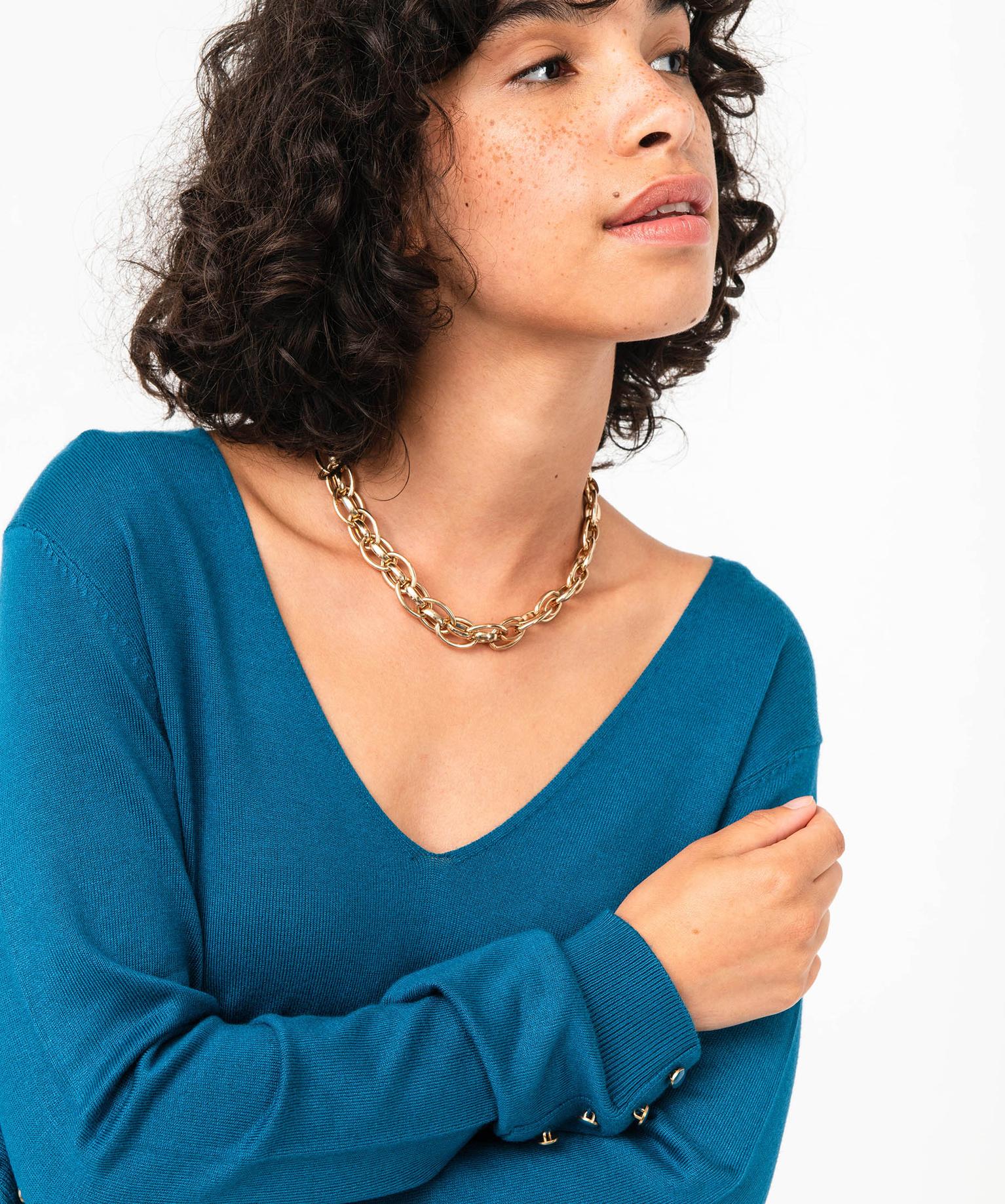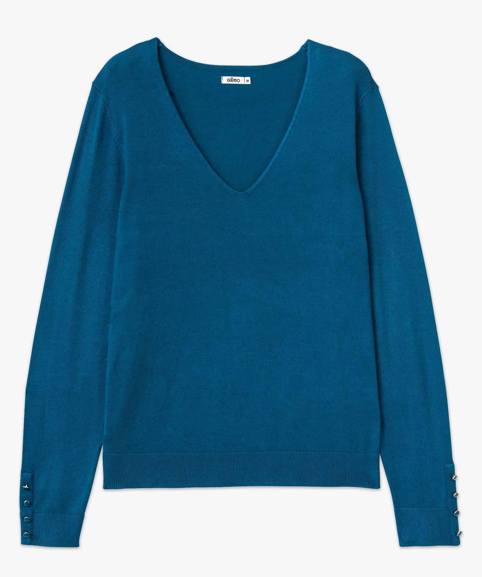 Pull en maille fine à col V et boutons fantaisie femme bleu
